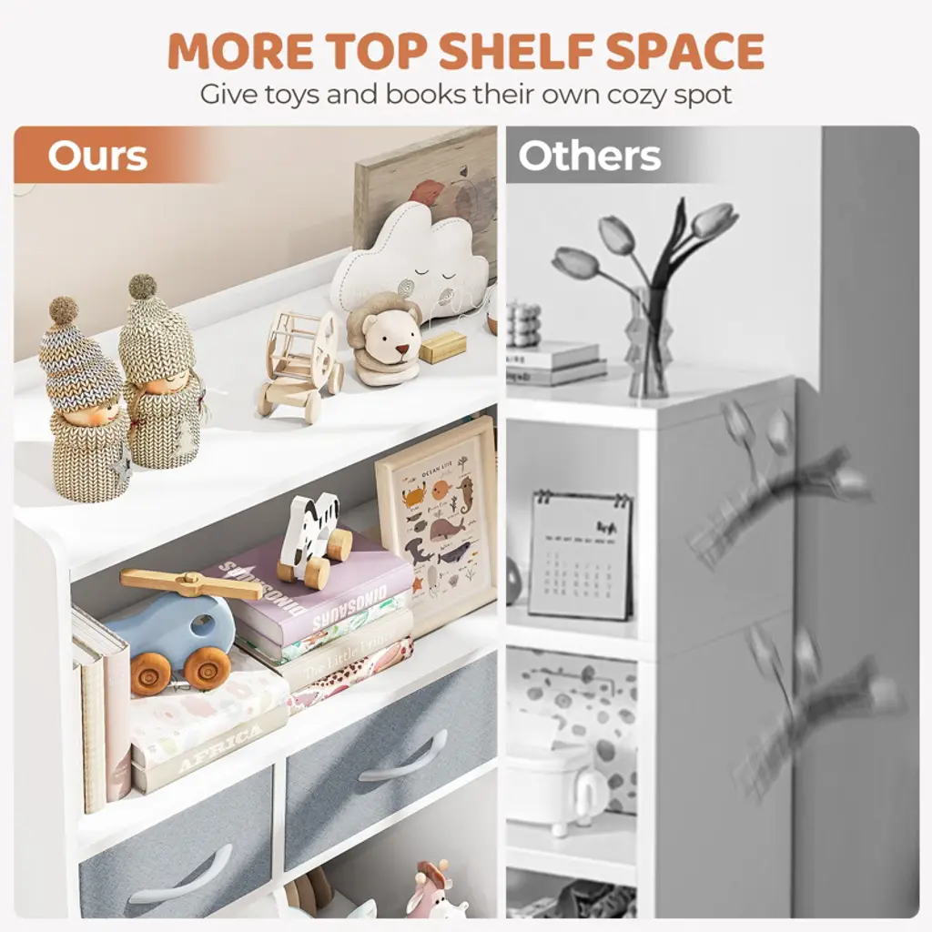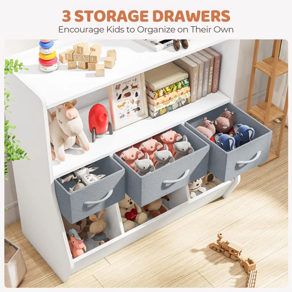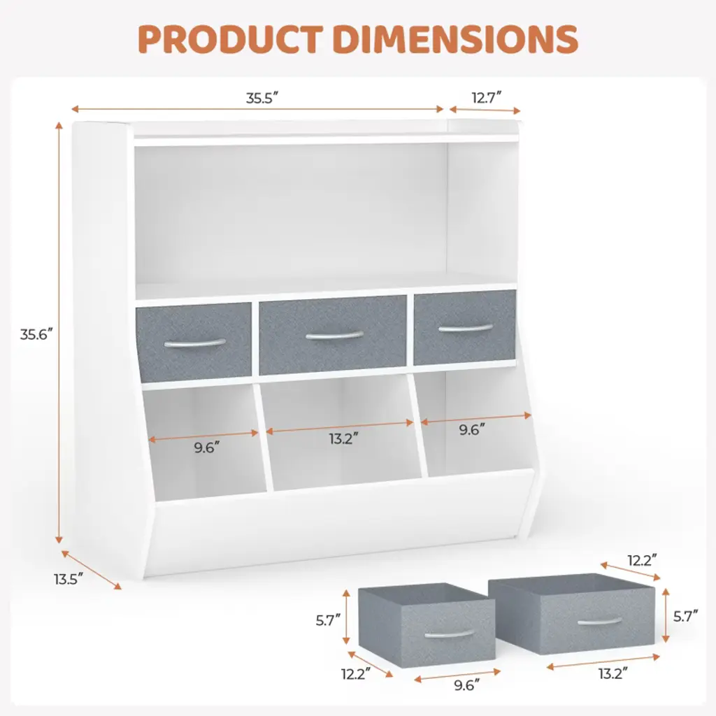 Are you tired of tidying up after the kids? Do you feel upset because of the toys and books are messy? Take a look at our children's three-tier cabinet! The stylish exterior makes it suitable for any room! Such as children's room, recreation room or living room. Its structure features two spacious open shelves, three non-woven drawers of different sizes, and three small bins. Shelves can be used to store books, magazines, DVDS, video games, etc. Drawers can be used to hold children's gloves, clothing and accessories. Our bottom three bins are ideal for sorting items, such as craft supplies, dolls and other toys. Also, the top surface provides an e xtra place for a photo frame or souvenir. This cabinet is made of healthy and environmentally friendly materials, so you don't have to worry about the negative impact on your health. It's a great way to stimulate children's interest and help them learn to sort. Features Shelves, drawers and bins, three storage forms are combined Large capacity storage space, easy to classify storage Fashionable and lightweight design, suitable for every scene Thickened plate construction, stable structure, sturdy High quality materials, environmental protection and non - to xic With detailed instructions to help you assemble Suggest to keep in dry environment, wipe it to clean Specifications Color: White Overall Dimension: 35.5''L x 13.5''W x 35.6''H Big Drawer Dimension: 13.2'L x 12.2''W x 5.7''H Small Drawer Dimension: 9.6'L x 12.2''W x 5.7''H Product Weight: 29lbs Package includes: 1 x Children’s Three-layer Cabinet 1 x Instruction