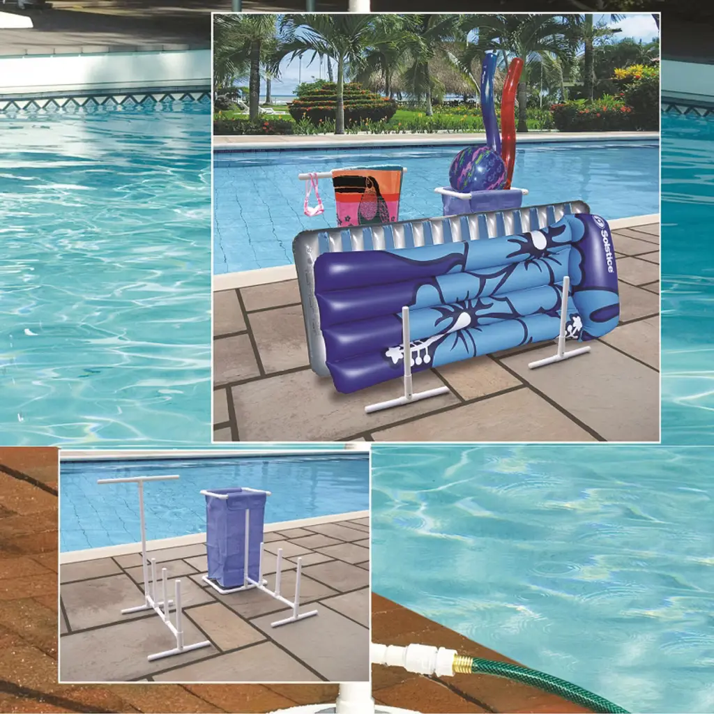 Your poolside can get unorganized very quickly when you have children playing in the pool or when throwing a party. Give this poolside organizer a try and keep your equipment nice and tidy. The organizer offers a perfect fitting for pool inflatables, towel drying, toys, and even beach balls. The next time you have guests they will surely be impressed with how organized your poolside is. Product Features: Blue and white poolside organizer Comes in 2 separate parts, but go together for storage Organizer fits more than one pool float, toys and games Hanging space for towels Constructed with PVC piping - durable rust proof There is a blue mesh hamper that hangs Keeps poolside clutter to a minimum Includes accessory hardware Dimensions: 37"H x 25"W x 15"D Material(s): plastic/metal