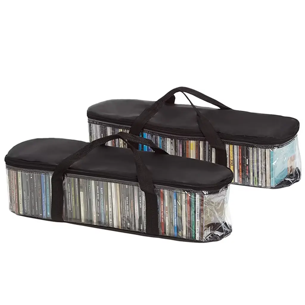 Protect and transport your entertainment library in a Media Storage Bag Set. Clear sides let you see what's inside and organize your titles. Each bag has a double-zippered closure and reinforced double-stitched handles. Every bag holds 50 discs, for 100 discs in each set. Made from: Polyester and PVC Measurements: CD storage, 22"W x 6"D x 5-1/4"H, each DVD storage, 22"W x 6"D x 8"H, each