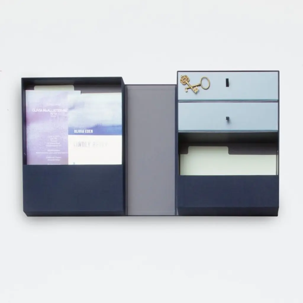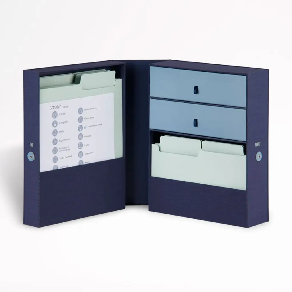 Organize all of your household's crucial information in one convenient spot with this display-worthy desk organizer wrapped in deep blue fabric. Surprisingly accommodating, the compact box provides vertical files for important documents such as leases, medical records, birth certificates and more. Adjustable divided drawers store keys, digital drives, gift cards, stamps and other important items. The illustrated labels keep everything organized, and the minimalist box looks modern in a bookcase or on an office shelf. The Vault makes a thoughtful graduation or housewarming gift.