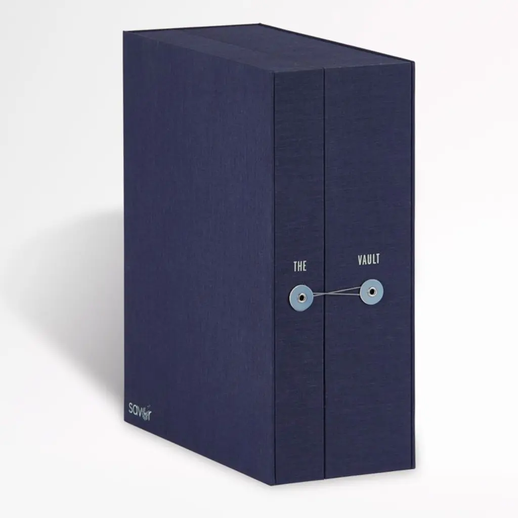 Organize all of your household's crucial information in one convenient spot with this display-worthy desk organizer wrapped in deep blue fabric. Surprisingly accommodating, the compact box provides vertical files for important documents such as leases, medical records, birth certificates and more. Adjustable divided drawers store keys, digital drives, gift cards, stamps and other important items. The illustrated labels keep everything organized, and the minimalist box looks modern in a bookcase or on an office shelf. The Vault makes a thoughtful graduation or housewarming gift.