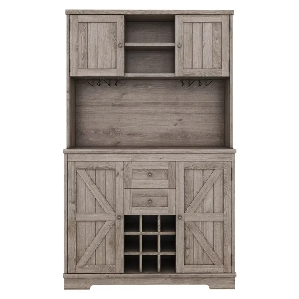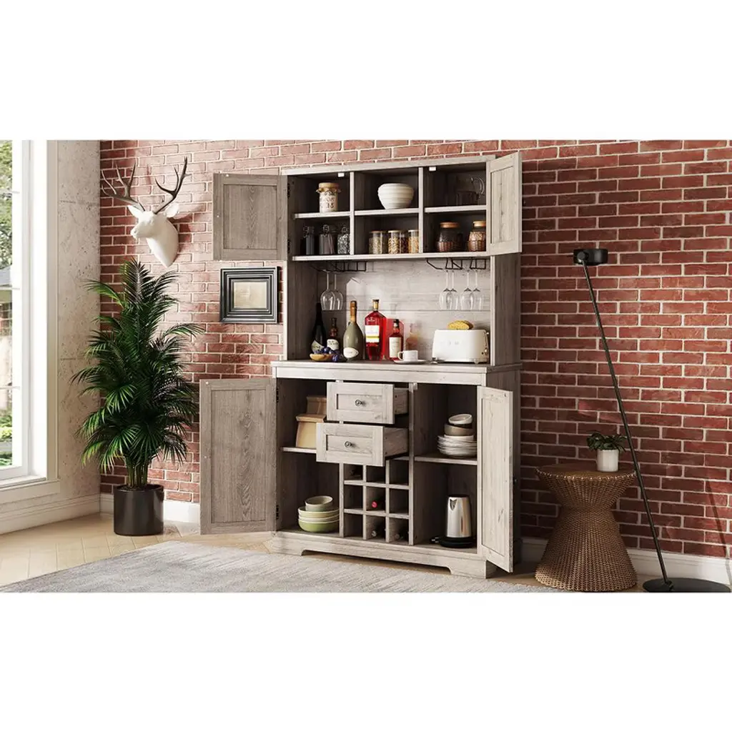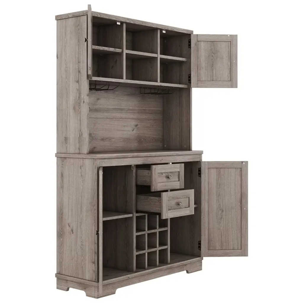 This freestanding bar cabinet gives you a convenient spot to brew coffee and concoct cocktails. The upper section features two open shelves and two cabinets with doors, while below are two drawers and even more storage space for plates, mugs, and barware. Nine cubbies also give you a place to store your favorite bottles of wine. The main prep area comes with hanging racks for stemware and ample room for a coffee maker and mixology essentials. If you are looking for the perfect addition to your furniture collection, this coffee bar cabinet is an inspired choice that looks great in your living room or dining room.