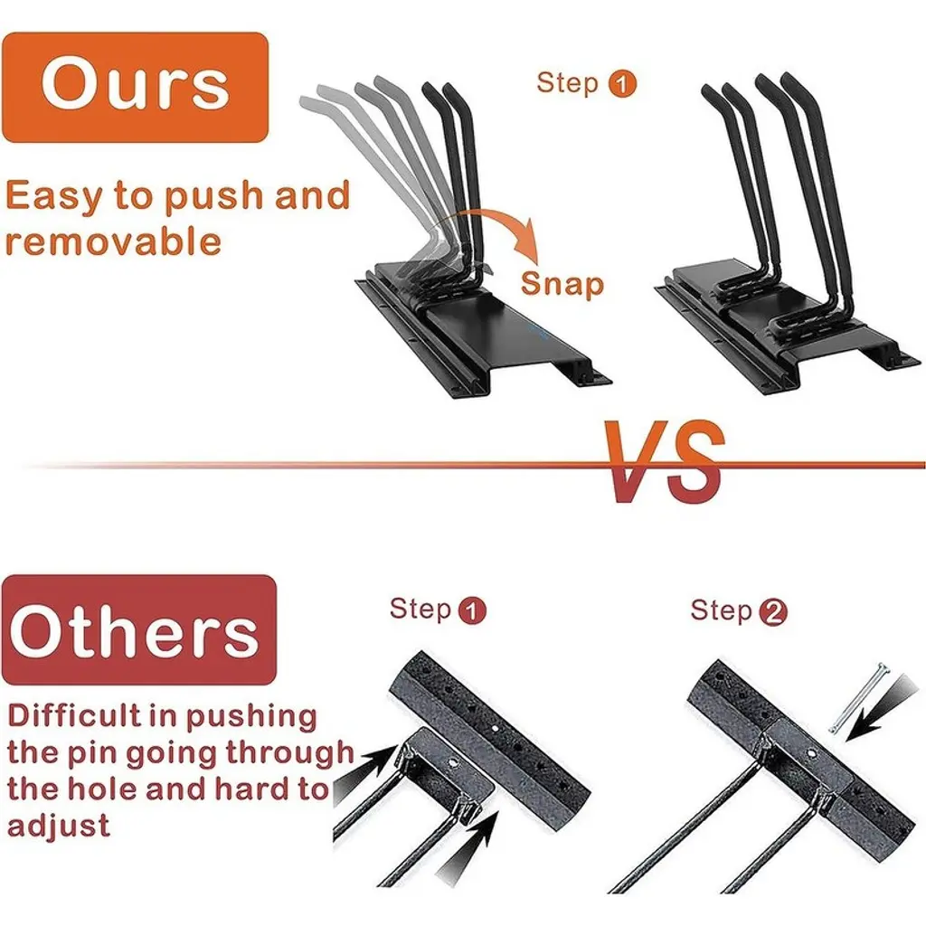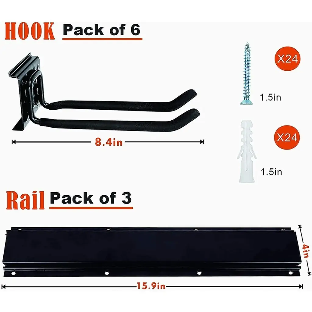 3 Pcs Heavy Duty Powder-Coated Steel Rails Boards: Different from others garage wall organizer, ours comes with 3 pcs rails boards. They are W / Epoxy Finish that won't scratch, rust or chip over time. Each slide rail can put 2-3 hooks and will not appear too crowded. 6 Pcs Removable Rubber Wrapped Hooks: The garden tool organizer have 6 pcs hooks. Each hook is 8.4inch, which support a variety of heavy items. They are wrapped with rubber that can protect your tools from slid and damage. These sturdy brackets glide effortlessly onto the rack & easily adjust. Space Save & Adjustable: This wall mounted rack is suitable for installation in a home, garage, store, cellar or store. Hang any setting such as hand power Tools, ski sport gear, beach chairs, backpacks & other outdoor stuff. It is very convenient that the hooks position could be adjusted according to the size of the items. Warm tips for Install: Before mount the garage storage rack, mark the position of the slide rail in case the nailed rack is not parallel to the horizontal. And then it's simple to wall studs with included anchors & fasteners. It durable enough to hang up to 300 pounds. Rack is 5X stronger than a regular shelf.This best Choice for Storage