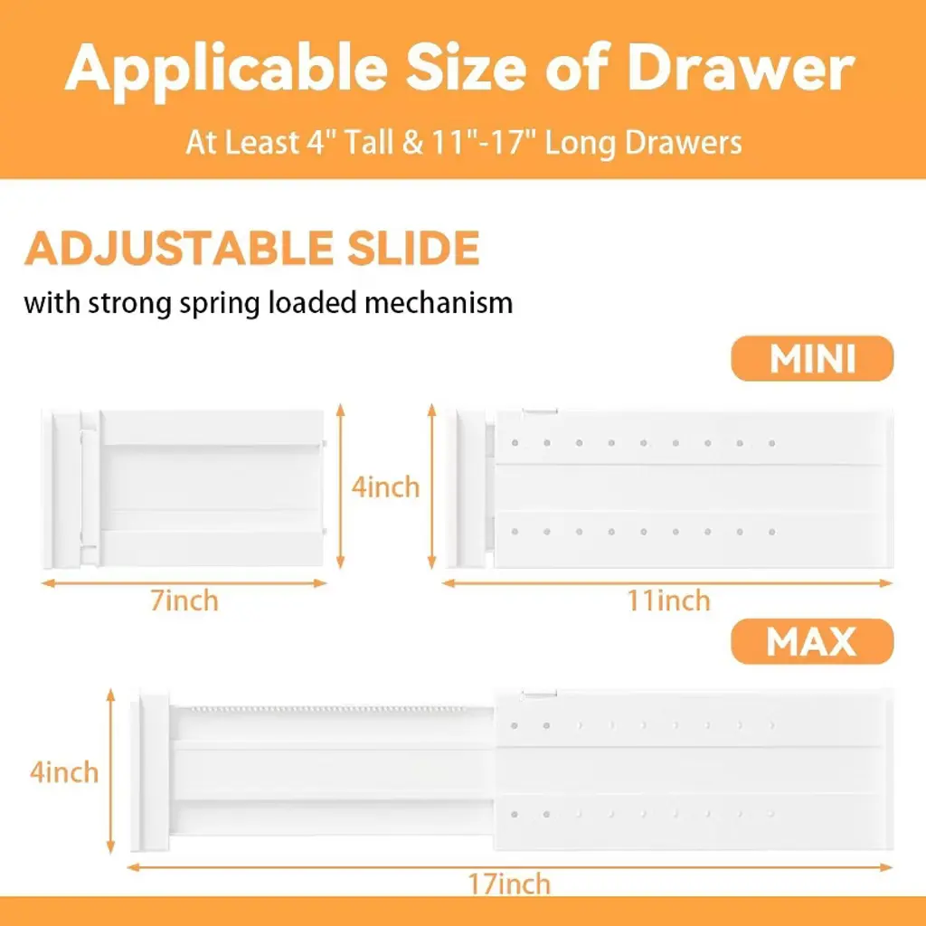 Universal fit, one board does it all (11"-17" freely adjustable): Still worried about drawer size? This adjustable drawer divider uses an innovative telescopic design that can be freely adjusted from 11 inches to 17 inches in length to perfectly fit any drawer size! Whether it's kitchenware and utensils, bathroom toiletries and makeup tools, or underwear, socks, and scarves in the closet, it adapts instantly without the need for measurement or cutting.