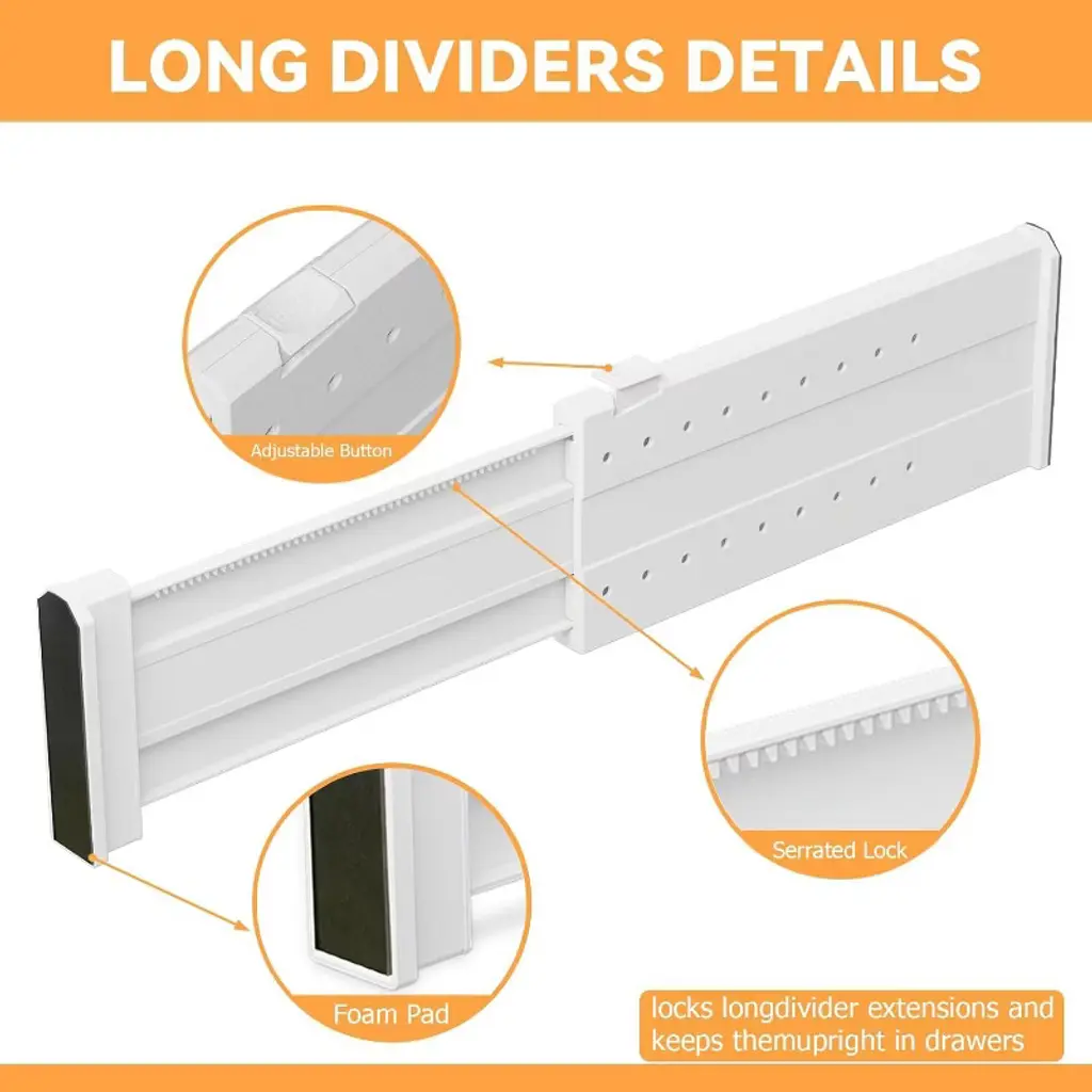 Universal fit, one board does it all (11"-17" freely adjustable): Still worried about drawer size? This adjustable drawer divider uses an innovative telescopic design that can be freely adjusted from 11 inches to 17 inches in length to perfectly fit any drawer size! Whether it's kitchenware and utensils, bathroom toiletries and makeup tools, or underwear, socks, and scarves in the closet, it adapts instantly without the need for measurement or cutting.