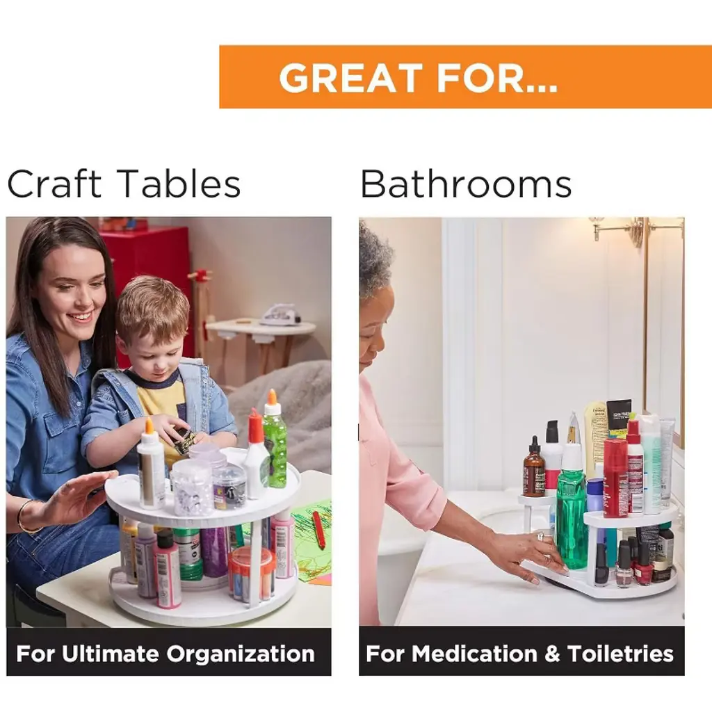 Introducing the Two-Tiered Dual Spin Spice Organizer—your answer to cluttered cabinets, hard-to-reach spices, and wasted space. This clever holder combines dual spinning turntables, a space-saving D-shaped design, and adjustable height to keep up to 40 spices, condiments, or small essentials neat, visible, and right at your fingertips. It fits most cabinets (10.75” depth, 13” width) and works beyond the kitchen—think fridges, bathrooms, even craft tables—turning chaos into streamlined, easy-to-use storage. Dual Spin Lazy Susan for Effortless Access: No more digging through stacked jars or losing track of spices! Built-in turntables let you spin either tier with a simple twist, bringing every item into view and within reach. It’s perfect for storing taller spices too—no more leaving larger bottles out because they don’t fit. Reclaim unused cabinet space and say goodbye to rummaging; everything you need is just a spin away. D-Shaped Design to Maximize Space: Unlike round organizers that leave gaps, this uniquely crafted D-shape fits flush against any cabinet or cupboard wall. That means it uses every inch of available space, holding up to 40 spices and condiments without wasting room. A quick spin pulls even back-row items forward, so you never have to stretch or knock over jars to grab what you need—turning messy cabinets into customized, tidy storage. Adjustable Height for Customized Storage: Whether you have tiny seasoning tins or tall spice bottles, this organizer adapts to you. Adjust the height between the two tiers to fit your items perfectly, maximizing storage capacity in pantries, cabinets, or fridges. The two levels ensure you can stack without overcrowding, keeping small and large essentials organized—no more one-size-fits-all frustration. Use It Anywhere in Your Home (Not Just the Kitchen): This organizer isn’t limited to spices! Stack cans and bottles in the fridge to free up shelf space; tidy bathroom counters by storing medications, toiletries, or skincare products; or keep craft tables ready for creativity by organizing paints, brushes, or small supplies. Its versatility makes it a must-have for every room, solving clutter wherever you need it. Perfect Size for Most Cabinets: With a depth of 10.75” and width of 13”, it fits seamlessly into most standard cabinets and cupboards—no need to measure twice or worry about it being too big or too small. It slides right in, instantly upgrading your storage without rearranging your entire kitchen or bathroom.