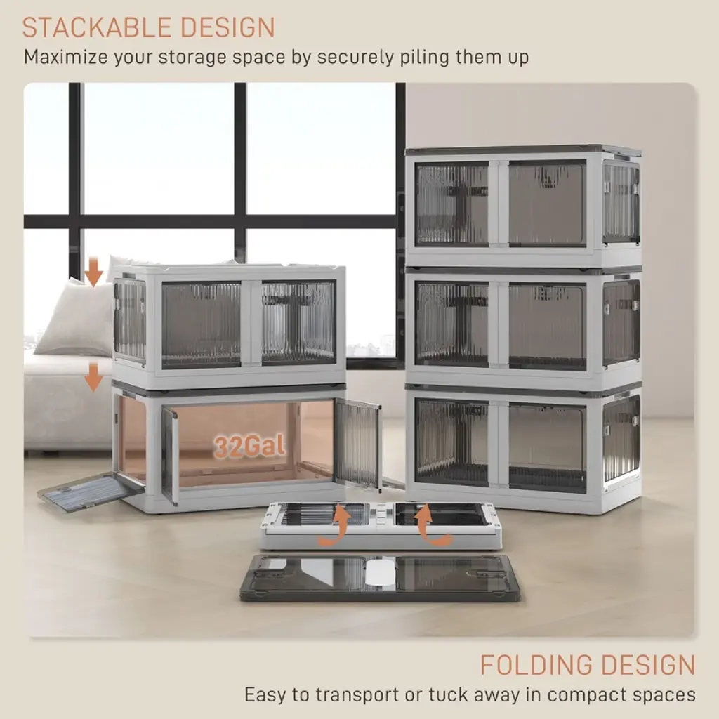 Multiple Usage Scenarios: Our versatile semi-transparent storage bins with doors are great for storing snacks, books, hats, pet foods, and more, which will declutter your bedroom, tidy up your living room, organize your office space, or even keep essentials within easy reach during car rides. Folding Design & Install-Free: When you need to relocate or store storage bins, ours are able to fold flat, making them easy to transport or tuck away in compact spaces. This collapsible storage box is easy to assemble and snaps together in just 10 seconds, no instructions or tools required. Effortless Access from Every Angle: Say goodbye to struggling with hard-to-reach items. With its 5-sided access design, this folding storage box allows you to retrieve and store your belongings conveniently, no matter the situation or location. Each door is fitted with a safe latch to prevent items falling out. Secure Stacking & Easy Mobility: The grooved top of the folding storage bins enables seamless stacking of multiple units, ensuring stability and preventing items from toppling. Maximize your storage space by securely piling them up. Equipped with four wheels, these stackable storage bins glide smoothly across various surfaces, enabling effortless movement and repositioning. Storage Chest Info:Overall Dimensions: 28.75" W x 19" D x 15.75" H.Folded Dimensions: 28.75" W x 19.25" D x 3.25" H.Inner Size: 27.25" W x 17.75" D x 15.25" H.Weight Capacity: 110 lbs. (Inner), 66 lbs. (Top).