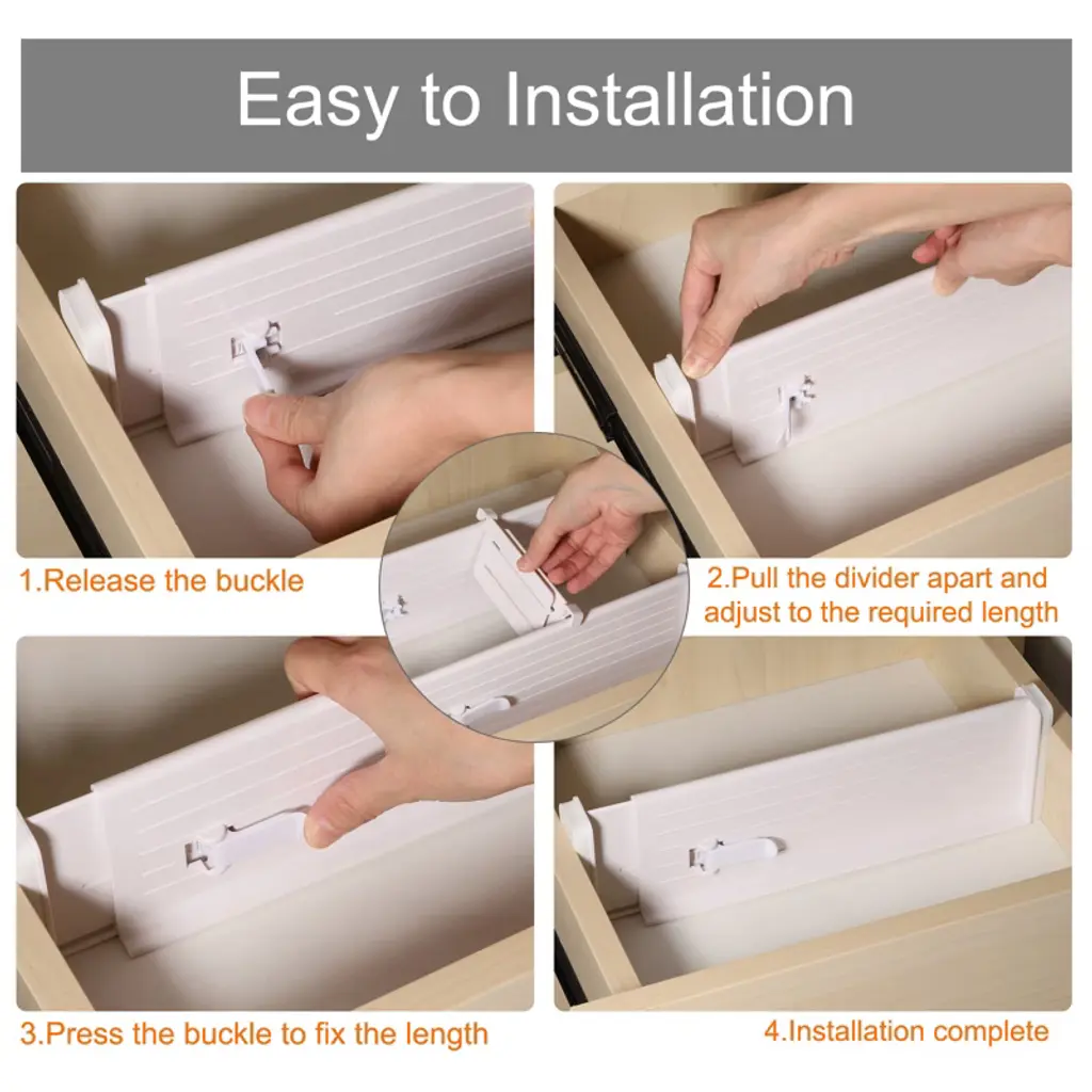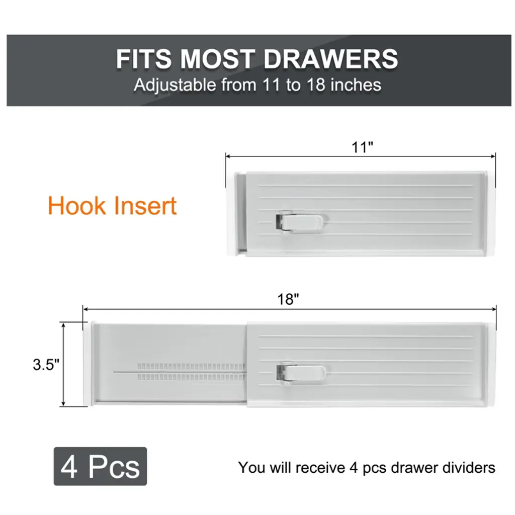 These adjustable drawer dividers are made from durable ABS material and feature foam sponges at the ends to prevent damage to your drawers. They can be expanded from 11 to 18 inches in length and are 3.5 inches high, making them suitable for a variety of organizing needs. Whether used in the kitchen, bedroom, or bathroom, these dividers help bring order to cluttered spaces. Installation is simple: press the top button to adjust the length, extend to secure, and lock in place. To remove, press the button and push the extended side back.