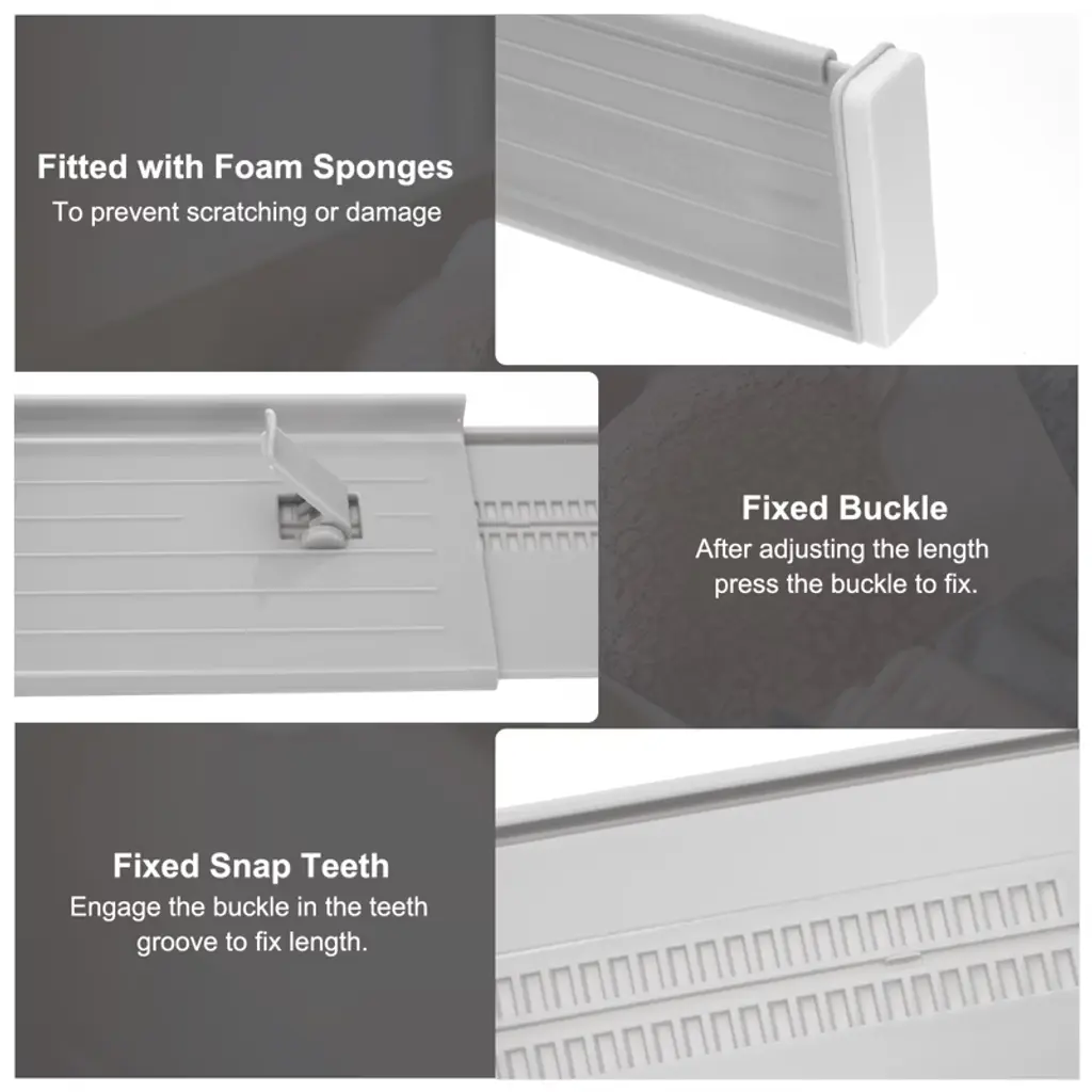 These plastic drawer dividers are perfect for organizing your belongings in various settings. Made from durable ABS material, they ensure longevity and comfort. The dividers are adjustable and expandable, ranging from 11" to 18" in length, and are 3.5" high. They feature foam sponges at the ends to prevent damage to drawer interiors. Easy to install and remove, simply press the top button to adjust and secure each divider. Their flexible placement allows for both vertical and horizontal use, catering to a variety of organizing needs. Ideal for organizing clothes, kitchen utensils, bathroom necessities, and more.