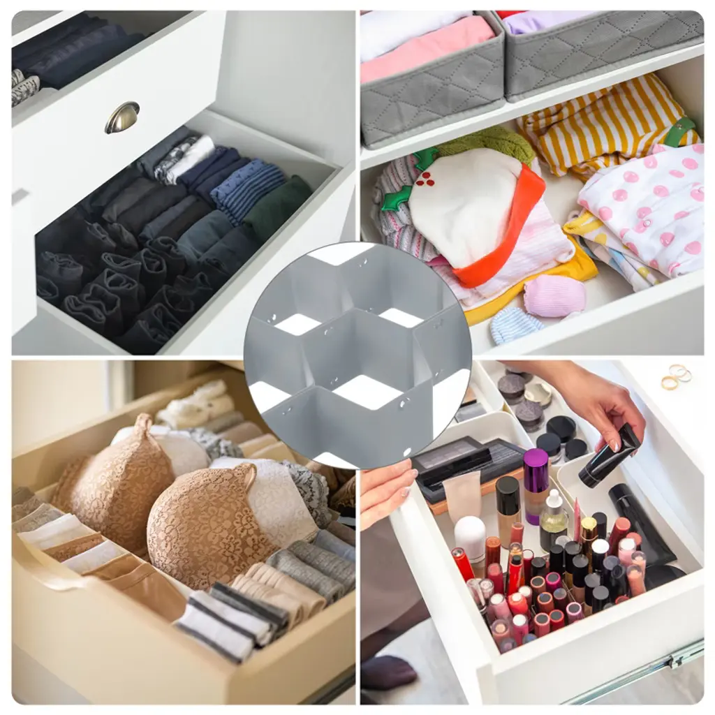 This plastic drawer divider is designed to maximize space and organize your drawers efficiently. Made from durable PP plastic, these dividers are flexible and long-lasting. The interlocking construction allows for easy assembly and disassembly, while the adjustable nature means they can be cut to fit any drawer or cupboard. Ideal for storing socks, underwear, ties, belts, scarves, jewelry, and cosmetics, these dividers ensure that your drawer space is fully utilized. When not in use, they can be folded up for easy storage.