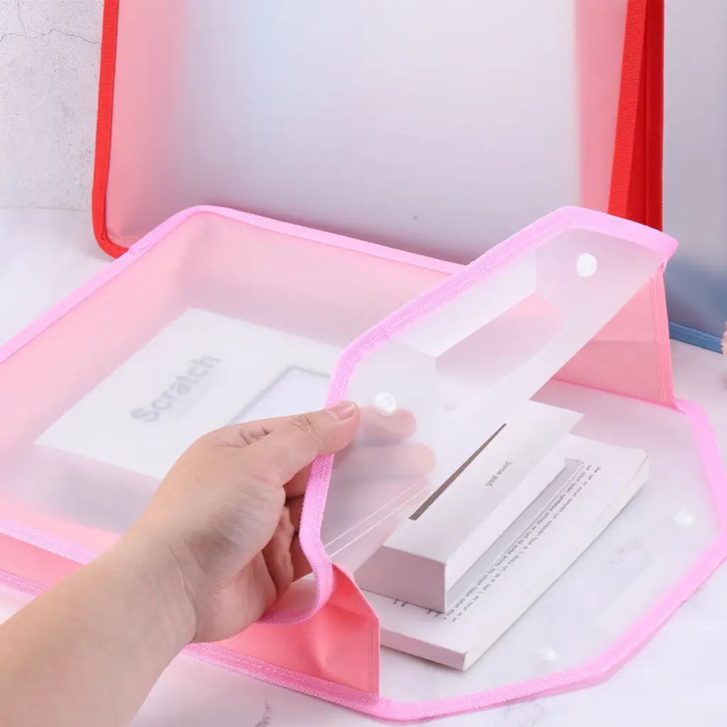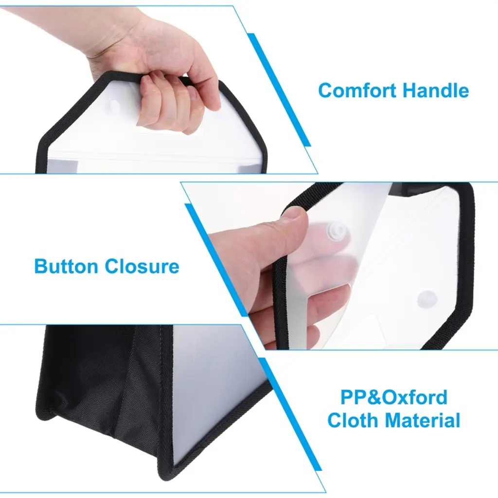Made of durable PP material, it's waterproof, scratch-resistant, and durable. Oxford cloth edging design, comfortable to the touch. The top button closure protects important scrapbook materials and prevents them from getting lost. The transparent design adds a modern, minimalist touch and provides easy access to your essentials. The large capacity accommodates a wide range of storage needs. It can hold a variety of items, such as scrapbooks, documents, papers, cards, photos, stickers, notebooks, cosmetics, and crafts. It's perfect for home, office, the beach, and more. Note: Please confirm dimensions before purchasing.