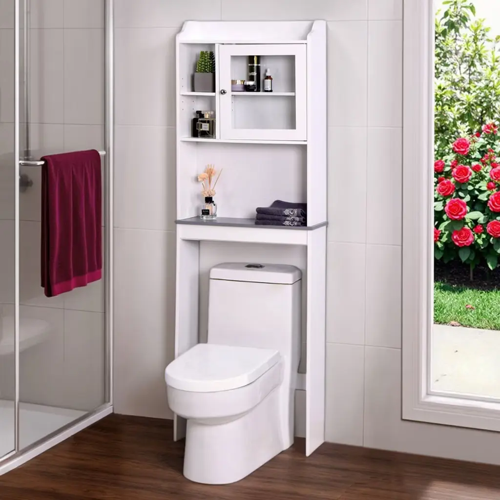 Transform your bathroom with this freestanding over-the-toilet storage. Designed with four cubby compartments and an open shelf, it provides ample space for storing towels, toiletries, and bath essentials. Made from durable MDF, this cabinet features an easy-to-clean white finish and is resistant to moisture. The adjustable shelves allow for customizable storage to fit your needs. The bead board back panel and clean design offer a stylish look that complements modern bathroom decor. With easy assembly, you’ll have a functional and chic storage solution in no time.