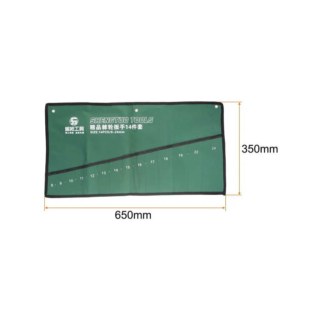 Size - 650mm x 350 mm / 25.6" x 13.8" (L*W), Pocket Quantity: 14, Applicable Wrench Size: 8mm/9mm/10mm/11mm/12mm/13mm/14mm/15mm/16mm/17mm/18mm/19mm/22mm/24mm.Material - Made of strong canvas. Straps are double sewn to the apron for extra strength and durability. Pre-drilled hole can hang the tool bag on the wall or other places, convenient to use.Feature - Keeps the wrenches against spills and easy to find all your wrench at one glance in the tools. Special roll-up feature of the canvas bag makes it easy to store and carry out.Application - With 14 tool pockets with printed metric labels, you can quickly define and safely organize your wrenches in your toolbox.Package Content - 1 piece of wrench organizer with multi pockets.Made with multi pockets of various sizes to organize wrench, you can find all your wrench at one glance in the tools.The canvas material body is both tear and abrasion-resistant, not easy to tear during use and lasts long.Special roll-up feature of the canvas bag makes it easy to store and carry out.Sewn strap on the tool bag makes it fast open and close the wrench organizer.Pre-drilled hole can hang the tool bag on the wall or other places, convenient to use.Metric labels of the wrench are printed on the bag, you can define the wrench size easily.Great tool for carpenters, woodworkers, electricians, machinists, master technicians, mechanics, painters, and anyone working on home improvement projects, cleaning and more.