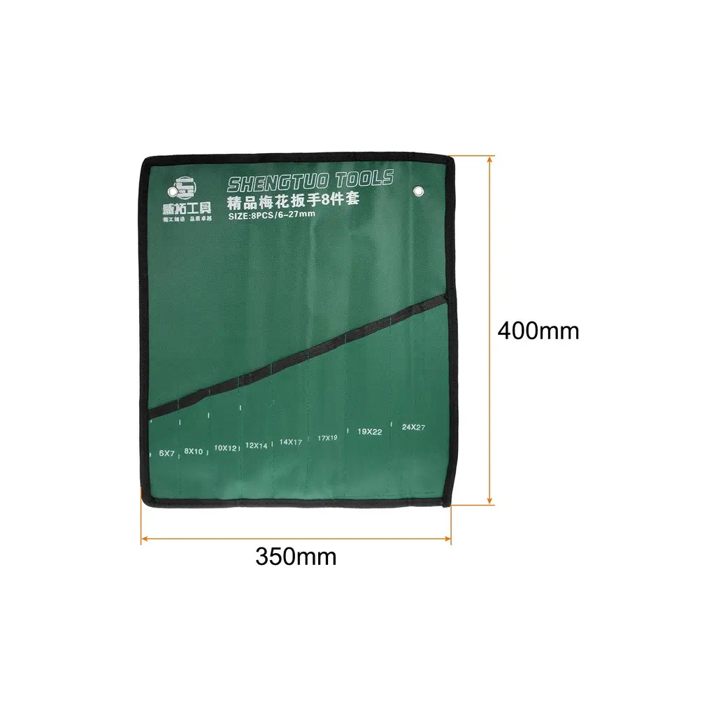 Size - 350mm x 400 mm / 13.8" x 15.8" (L*W), Pocket Quantity: 8, Applicable Wrench Size: 6x7mm/8x10mmm/10x12mm/12x14mm/14x17mm/17x19mm/19x22mm/24x27mm.Material - Made of strong canvas. Straps are double sewn to the apron for extra strength and durability. Pre-drilled hole can hang the tool bag on the wall or other places, convenient to use.Feature - Keeps the wrenches against spills and easy to find all your wrench at one glance in the tools. Special roll-up feature of the canvas bag makes it easy to store and carry out.Application - With 8 tool pockets with printed metric labels, you can quickly define and safely organize your wrenches in your toolbox.Package Content - 1 piece of wrench organizer with multi pockets.Made with multi pockets of various sizes to organize wrench, you can find all your wrench at one glance in the tools.The canvas material body is both tear and abrasion-resistant, not easy to tear during use and lasts long.Special roll-up feature of the canvas bag makes it easy to store and carry out.Sewn strap on the tool bag makes it fast open and close the wrench organizer.Pre-drilled hole can hang the tool bag on the wall or other places, convenient to use.Metric labels of the wrench are printed on the bag, you can define the wrench size easily.Great tool for carpenters, woodworkers, electricians, machinists, master technicians, mechanics, painters, and anyone working on home improvement projects, cleaning and more.