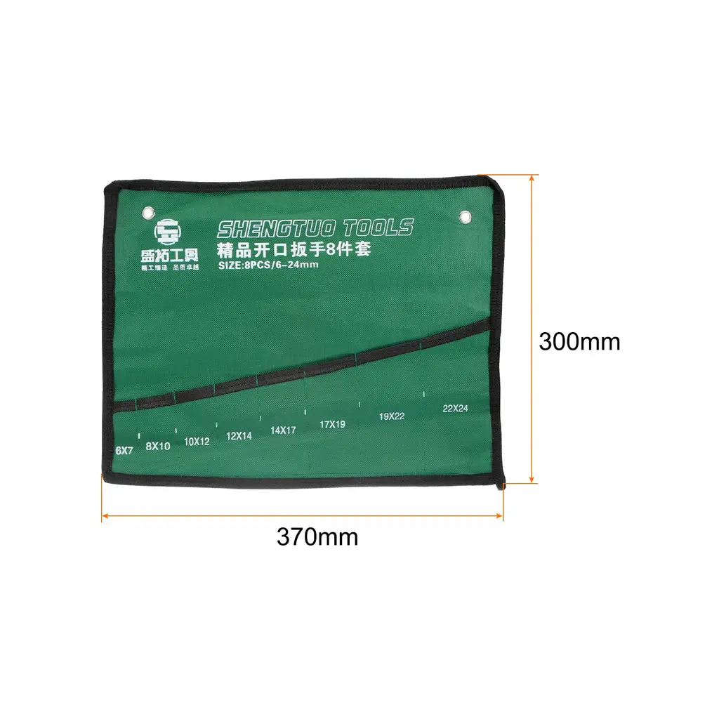 Size - 370mm x 300 mm / 14.6" x 11.8" (L*W), Pocket Quantity: 8, Applicable Wrench Size: 6x7mm/8x10mmm/10x12mm/12x14mm/14x17mm/17x19mm/19x22mm/22x24mm.Material - Made of strong canvas. Straps are double sewn to the apron for extra strength and durability. Pre-drilled hole can hang the tool bag on the wall or other places, convenient to use.Feature - Keeps the wrenches against spills and easy to find all your wrench at one glance in the tools. Special roll-up feature of the canvas bag makes it easy to store and carry out.Application - With 8 tool pockets with printed metric labels, you can quickly define and safely organize your wrenches in your toolbox.Package Content - 1 piece of wrench organizer with multi pockets.Made with multi pockets of various sizes to organize wrench, you can find all your wrench at one glance in the tools.The canvas material body is both tear and abrasion-resistant, not easy to tear during use and lasts long.Special roll-up feature of the canvas bag makes it easy to store and carry out.Sewn strap on the tool bag makes it fast open and close the wrench organizer.Pre-drilled hole can hang the tool bag on the wall or other places, convenient to use.Metric labels of the wrench are printed on the bag, you can define the wrench size easily.Great tool for carpenters, woodworkers, electricians, machinists, master technicians, mechanics, painters, and anyone working on home improvement projects, cleaning and more.