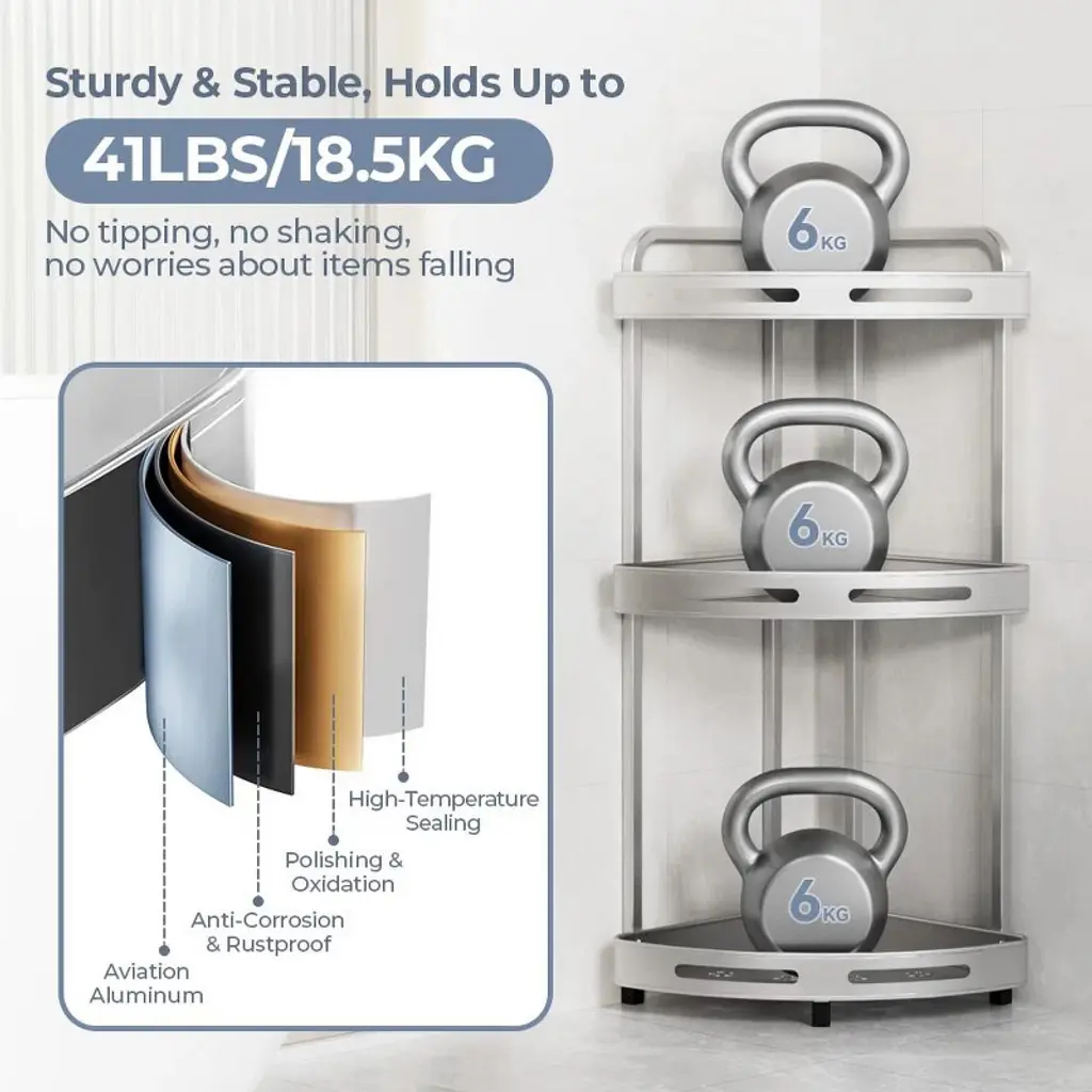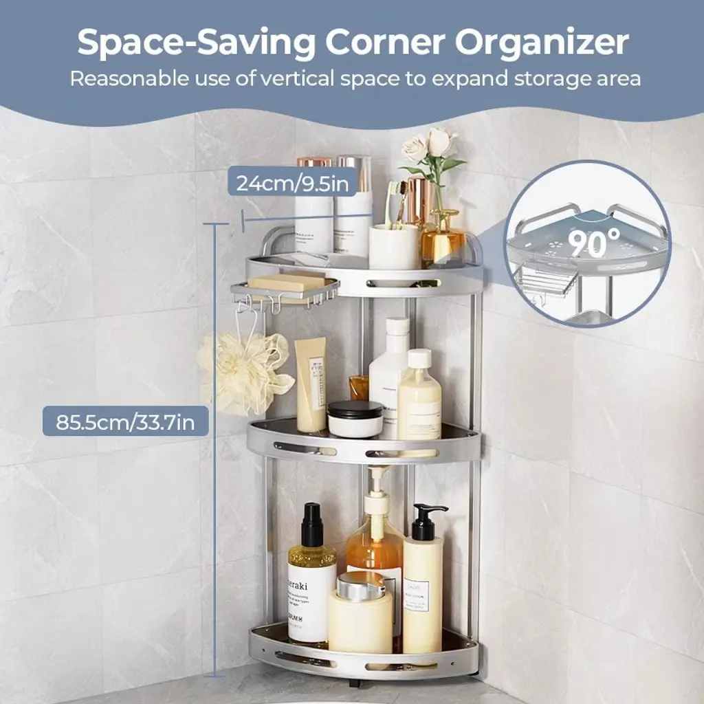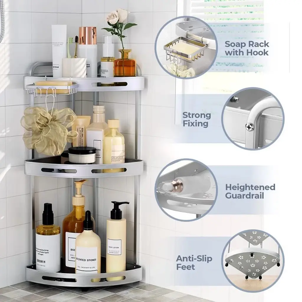 Upgrade Your Bathroom Game with This Sleek Corner Shower Caddy!Maximize your bathroom space without sacrificing style. This 3-tier corner shower caddy fits snugly in any corner, turning clutter into clean. Built with rust-resistant aluminum, it holds up to 13 lbs per shelf, perfect for those family-size shampoo bottles, body wash, razors & more.✔Space-saving design✔Built-in soap holder + razor hooks✔Slip-resistant feet with rubber sleeves for extra stabilityNo tools? No problem. Assembly is a breeze. Whether you're refreshing your bathroom or organizing your college dorm, this modern shelf adds instant style and function.SPECIFICATIONSSpecial Feature: Rust Proof, Space SavingProduct Dimensions: 12"D x 8.7"W x 22.3"HStyle: ModernSize: 3-tierAssembly Required: YesPACKAGING INCLUDES1x Corner Shower Caddy StandCONTACT USIf you have any problems with our items or services, please feel free to contact us any time.We are always online and do our best to solve your problems and provide you with the best customer services.