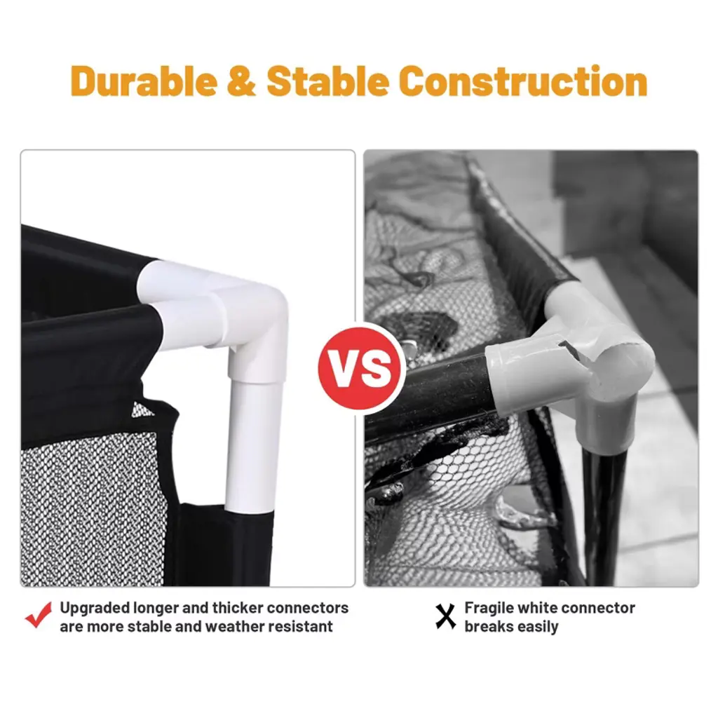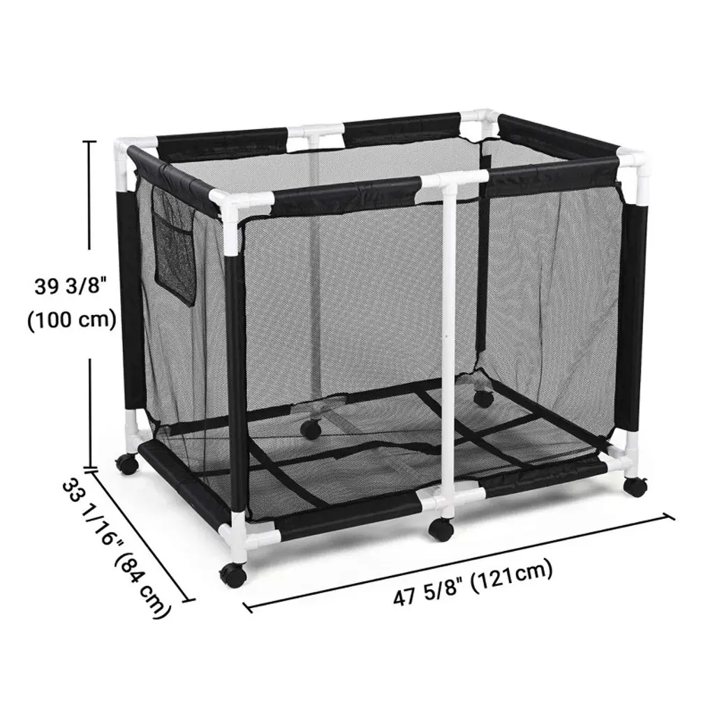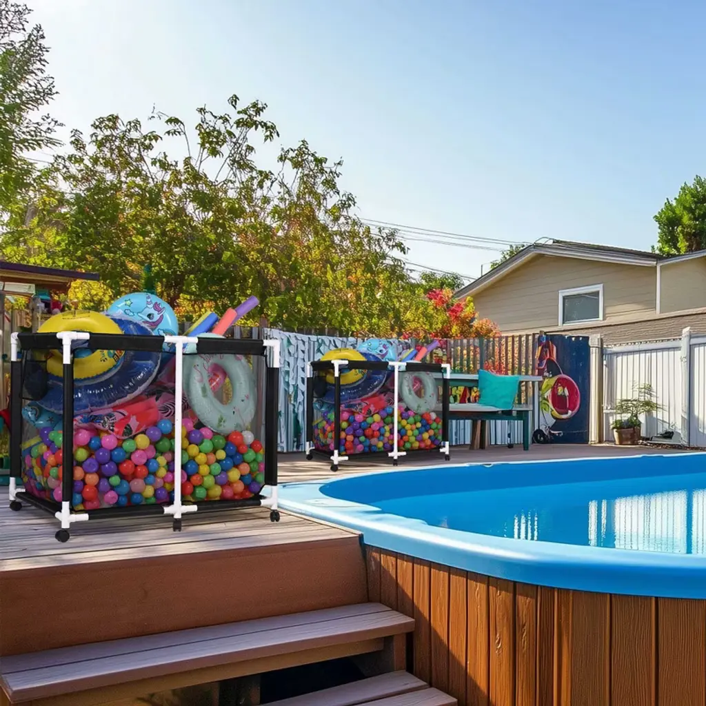 Features:- Large Storage Capacity - This 48"x33"x39" Extra Large Mesh Pool Storage Bin boasts a large capacity of 30 kg, spacious enough for storing surfboards, swimming rings, floating beds, and more, along with a pocket for goggles, suitable for big family use to keep your pool area neat and clutter-free- Breathable & Anti-Moisture - Features breathable mesh that allows good air circulation and drainage to prevent moisture buildup at the bottom, ensuring your pool toys and equipment remain dry, hygienic and free of chlorine odor for next use- Easy Mobility - Equipped with 6 smooth-rolling wheels for making it easy to move around the pool and put away pool toys, 4 wheels lockable for securely anchoring the storage bin for added stability- Simple DIY Assembly - Designed for straightforward assembly with wrench and hammer included, just install the poles under the net, connect the poles with connectors, and fixate the casters under the frame- Solid Construction - Made of strong and abrasion-resistant PVC tubes and reinforced connectors, this storage bin is built to withstand the elements, ensuring a longer lifespanSpecifications:- Overall Dimension(LxWxH) 47 5/8" x 33 1/16" x 39 3/8" (121 x 84 x 100 cm)- Pole Diameter 1 1/4" (3.2 cm)- Net Weight 13.5 Lbs (6.1 kg)Package Contents:- 4x Corner Tube Connectors- 2x T-Shape Tube Connectors- 4x 4-way Tube Connectors- 2x 5-way Tube Connectors- 6x Wheels (4 lockable)- 8x A Tubes- 5x B Tubes- 6x C Tubes- 1x Mesh Net- 1x Wrench- 1x Hammer- 1x Manual