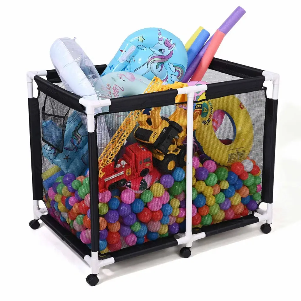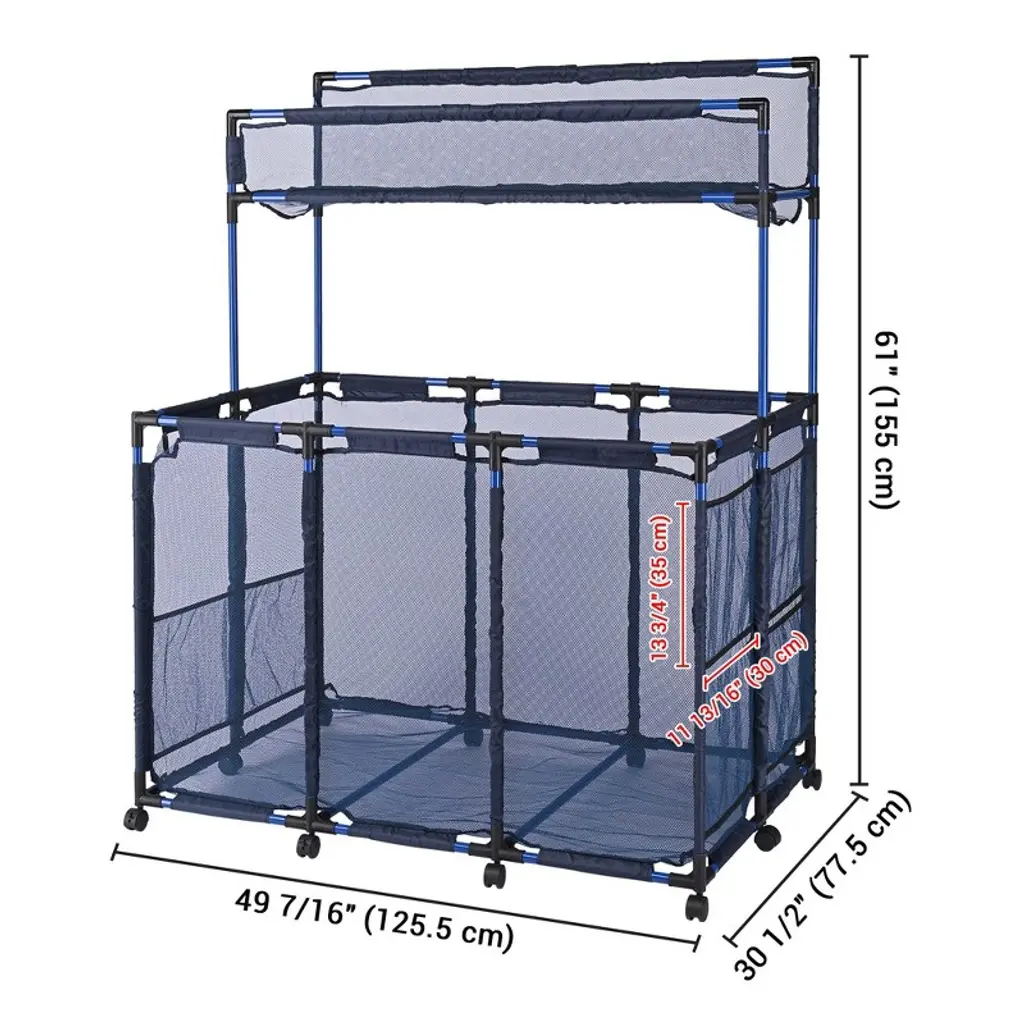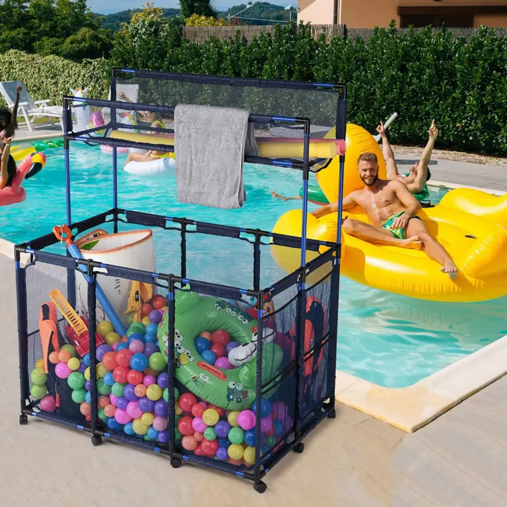 Features:- Portability & Wide Application - This 49 7/16" x 30 1/2" x 61" Mesh Pool Storage Bin Cart features 10 wheels, a detachable and lightweight design for effortless movement and easy & space-saving storage, along with a 30Lbs max weight capacity for keeping pool noodles, swimming rings, balls and other accessories in home or public swimming pools, water parks, natatoriums and more- Large Storage - Features a large basket with inner size of 46 7/8" x 28 3/8" x 30 11/16" for providing spacious space for storing different equipment, swimming rings, big inflatable toys, floats and more, along with side pockets for keeping goggles, swimming caps and small toys in place- Noodle Holder - Comes with a top noodle holder for storing your pool noodles and long items, saving more space and ensuring easy accessing to the noodle you need; you can also hang your towels on the holder bars, allowing for convenient use after swimming- Mesh Hollow Design - Features polyester mesh fabric which is breathable for better air circulation and effective water draining, enabling quick drying your pool equipment and accessories, ideal for avoiding residual water and keeping your things dry for frequent use- Durable Construction & Easy Installation - Sturdy metal tubes are covered with powder coating for resistance against rust, wear-and-tear and scratches, ensuring a stable and firm construction with a long life; Easy to install without using extra toolsSpecifications:- Overall Dimension(LxWxH): 49 7/16" x 30 1/2" x 61"- Side Pocket Size: 13 3/4" x 11 13/16"- Wheel Diameter: 1 1/2" - Max. Weight Capacity: 33 Lbs - Net Weight: 16.42 Lbs Package Contents:- 50x Tubes- 4x Corner Connectors- 6x T-Shape Connectors- 6x 3-way Connectors- 4x 4-way Connectors- 10x Wheels (5 lockable)- 2x Mesh Cloths- 1x Wrench- 1x Manual
