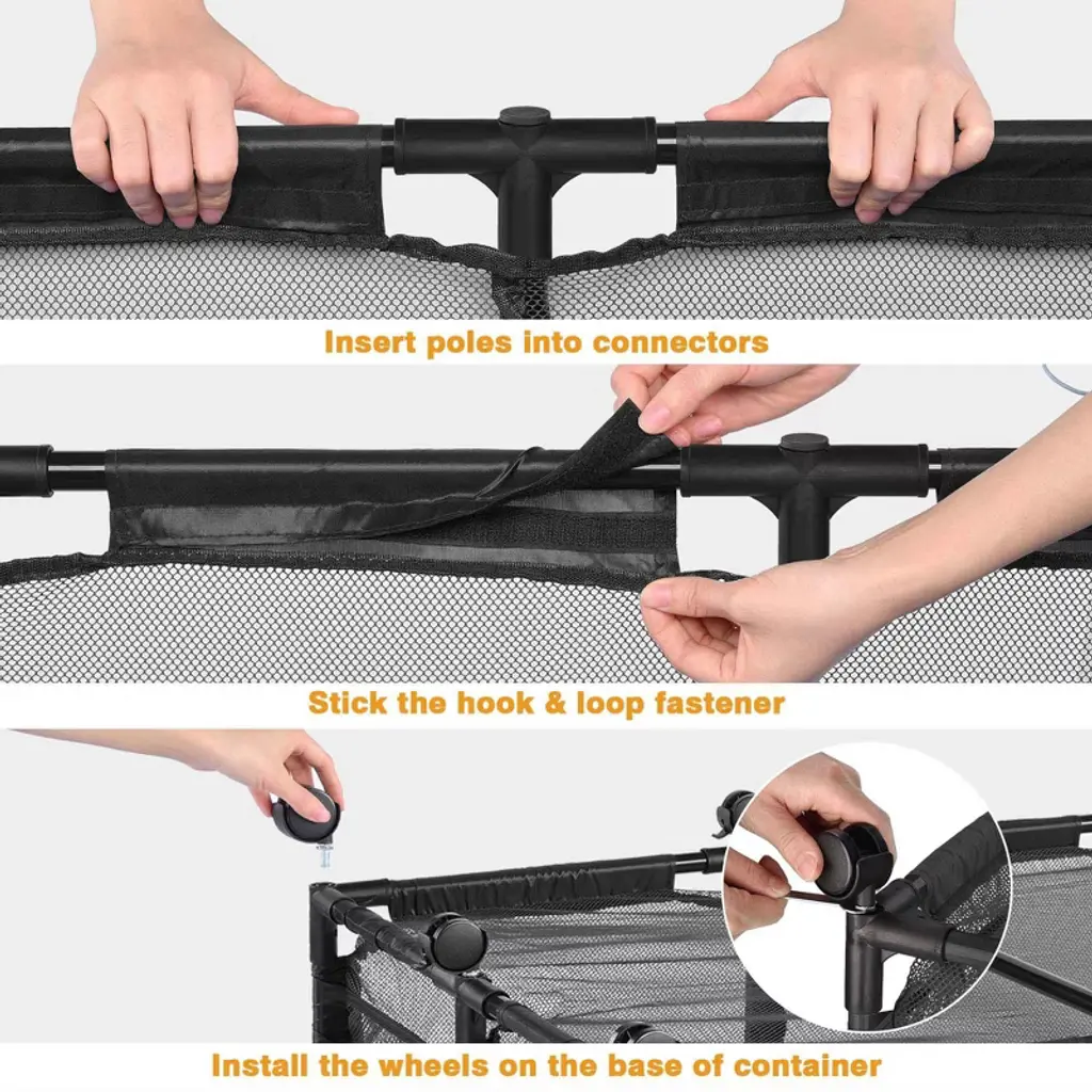 Features:- Large Capacity - This 65"x30"x33" Mesh Pool Storage Bin features a 63.5Lbs maximum weight capacity which supports large-size swimming accessories such as pool noodles and floats, along with side pockets for holding small accessories such as goggles and swimming caps, perfect for public pools, water parks, natatoriums, etc.- Easy to Move - Equipped with 12 wheels for effortless moving and transportation, 6 of them coming with locks for added stability, easily pushed along to pick up pool toys, equipment and accessories- Easy Installation - Features a quick tool-free DIY installation process with full accessories included, while also being easily detachable for space-saving storage indoors or outdoors- Anti-Moisture - Made of breathable mesh, this pool storage bin allows sufficient airflow circulation for quick, effective drying of pool equipment and accessories, avoiding residual water, chlorine odor- Durable Construction - Features sturdy metal tubes with rust-resistant coating, reinforced connectors which firmly hold the tubes together, along with a high-quality polyester mesh offering strong support for water toysSpecifications:- Overall Dimension(LxWxH): 64 15/16" x 30 5/16" x 33 1/4" (165 x 77 x 84.5 cm)- Side Pocket Dimension: 13 3/4" x 11 13/16" (35 x 30 cm)- Wheel Diameter: 1 1/2" (3.8 cm)- Max. Weight Capacity: 63.5 Lbs (28.8 kg)- Net Weight: 14.3 Lbs (6.5 kg)Package Contents:- 1x Mesh Net- 12x Wheels- 12x A Tubes- 3x B Tubes- 16x C Tubes- 8x D Tubes- 8x Corner Tube Connectors- 10x T-Shape Tube Connectors- 6x 4-way Tube Connectors- 1x Wrench- 1x Manual
