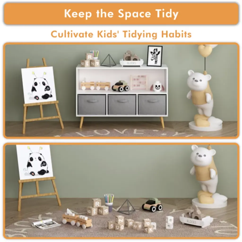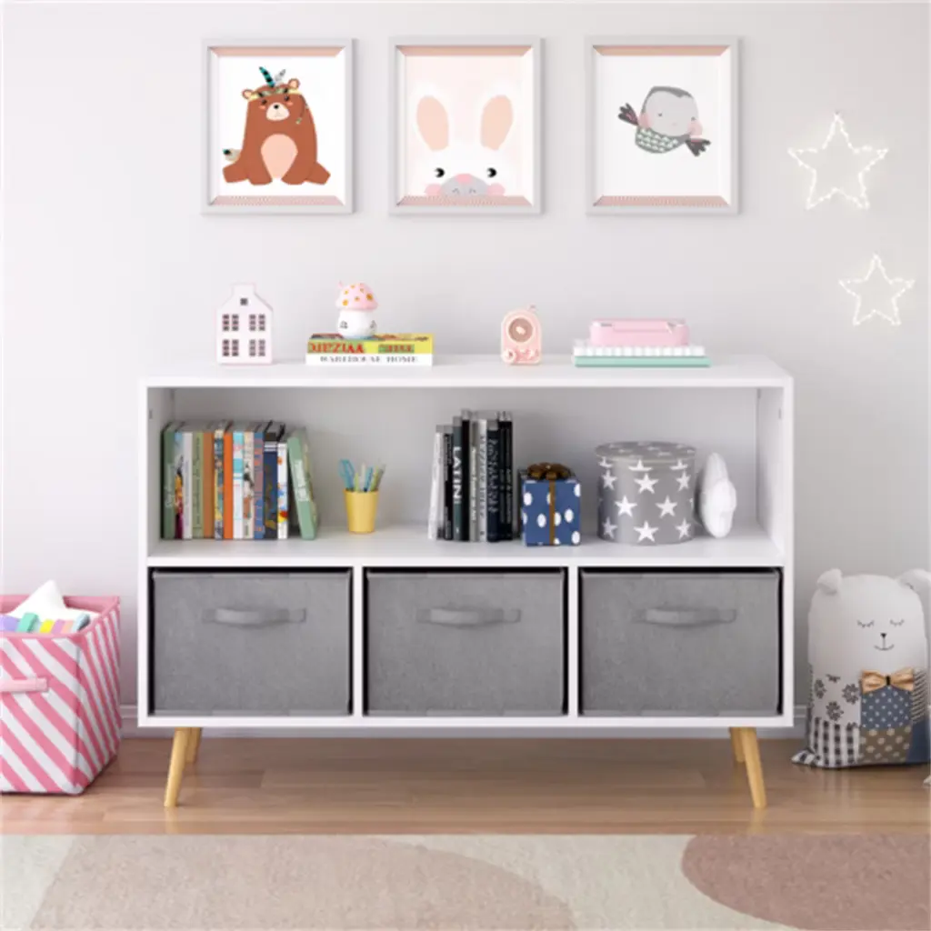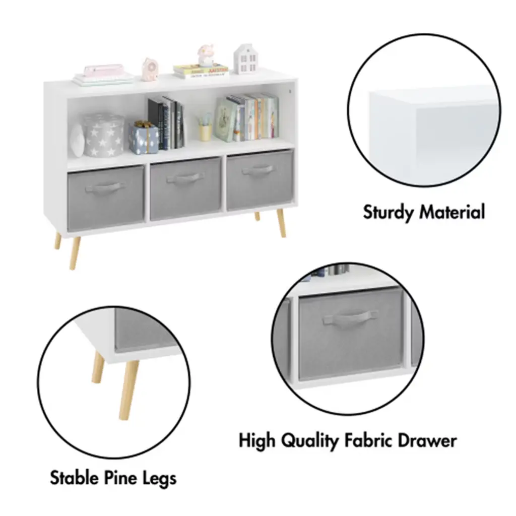 The YONWAY Kids Bookcase is a stylish and practical storage solution designed to meet the needs of young children while enhancing the beauty of any room. With a modern design in a combination of white and Gray, this bookcase is the perfect addition to living rooms, kids' rooms and play areas. Made of high-density MDF and pinewood legs, the bookcase is durable and safe, without any chemical odors that may be harmful to children. One of the highlights of this bookcase is its versatility. It contains three foldable fabric drawers that are just the right size to accommodate a variety of items, such as books, toys, art supplies, and more. This versatile design helps keep children's spaces organized and clutter-free. In addition, the bookcase is equipped with safety buckles that can be fixed to the wall, providing additional stability to ensure that the bookcase is stable.
