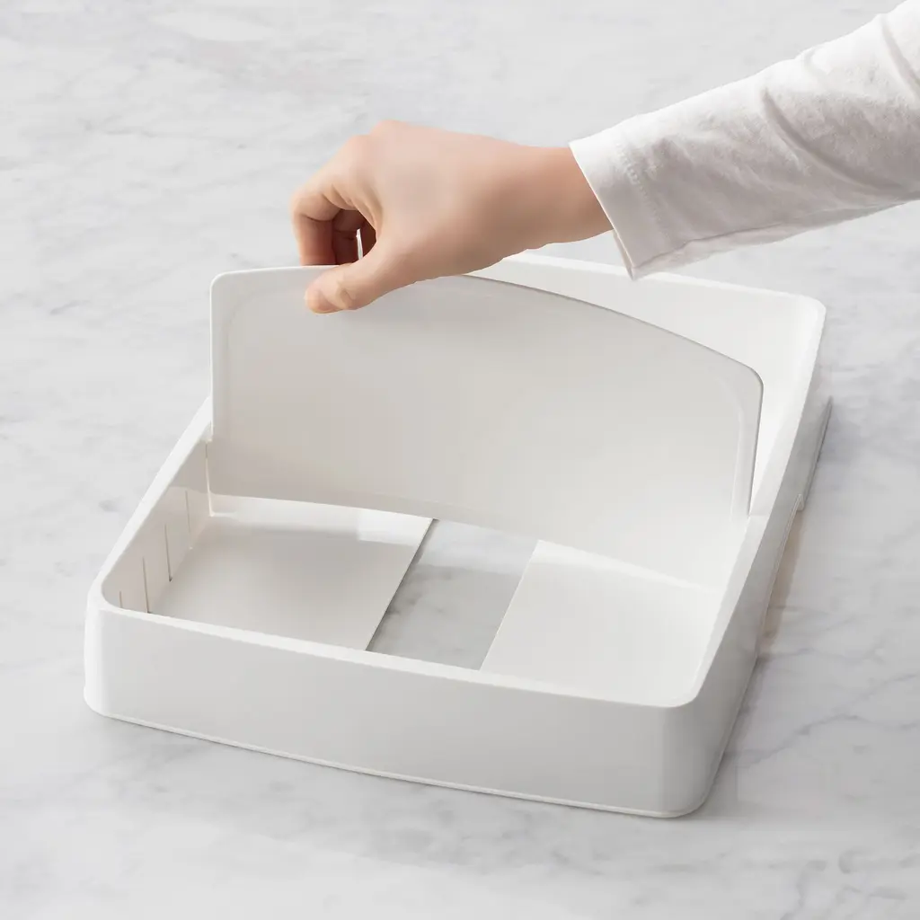 StoraLid® manages your reusable container lid collection. Expandable base maximizes cabinet space. Adjustable dividers keep lids upright. Leftovers can be packed in a snap.