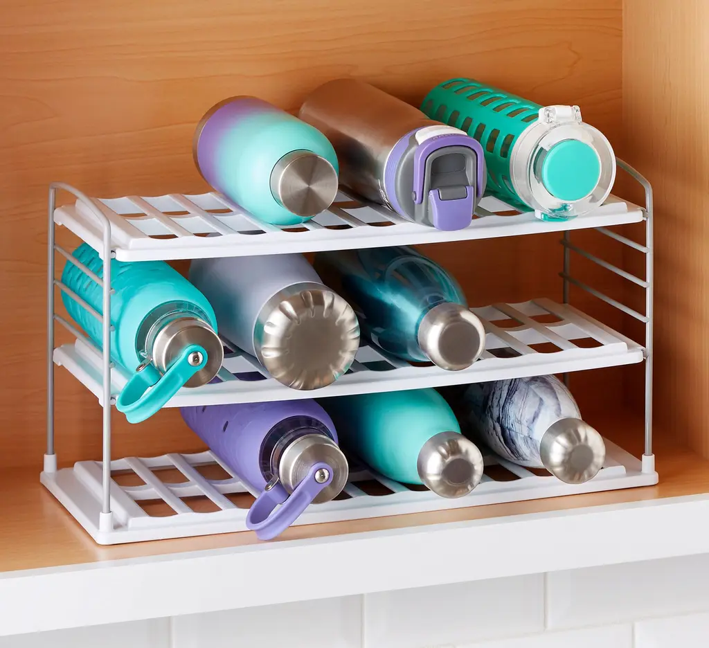 Upspace bottle organizer stores bottles horizontally. Shelf can be adjusted to fit any size bottle. Snaps together in one minute. Holds up to 20 lbs.