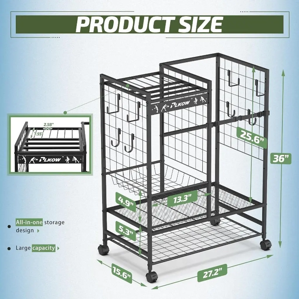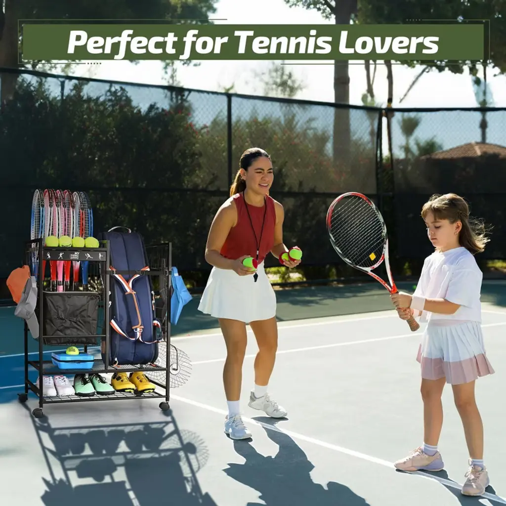 Introducing our all-in-one tennis organizer, the ultimate storage solution for every tennis enthusiast! This versatile rack keeps your bags, rackets, balls, and shoes neatly organized and easily accessible in one compact unit. With a spacious capacity that holds up to 7 rackets, a large bag, and 20+ balls, it’s perfect for players of all levels. Designed for versatile use in garages, clubs, schools, or home gyms, it features 360° lockable wheels for smooth mobility and a sturdy metal frame built to last. Ideal for players, coaches, and families.