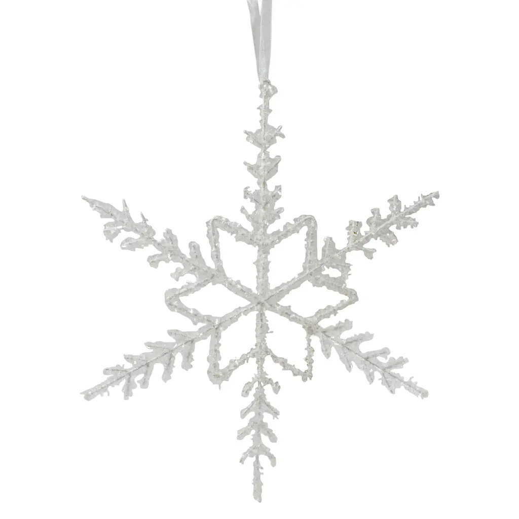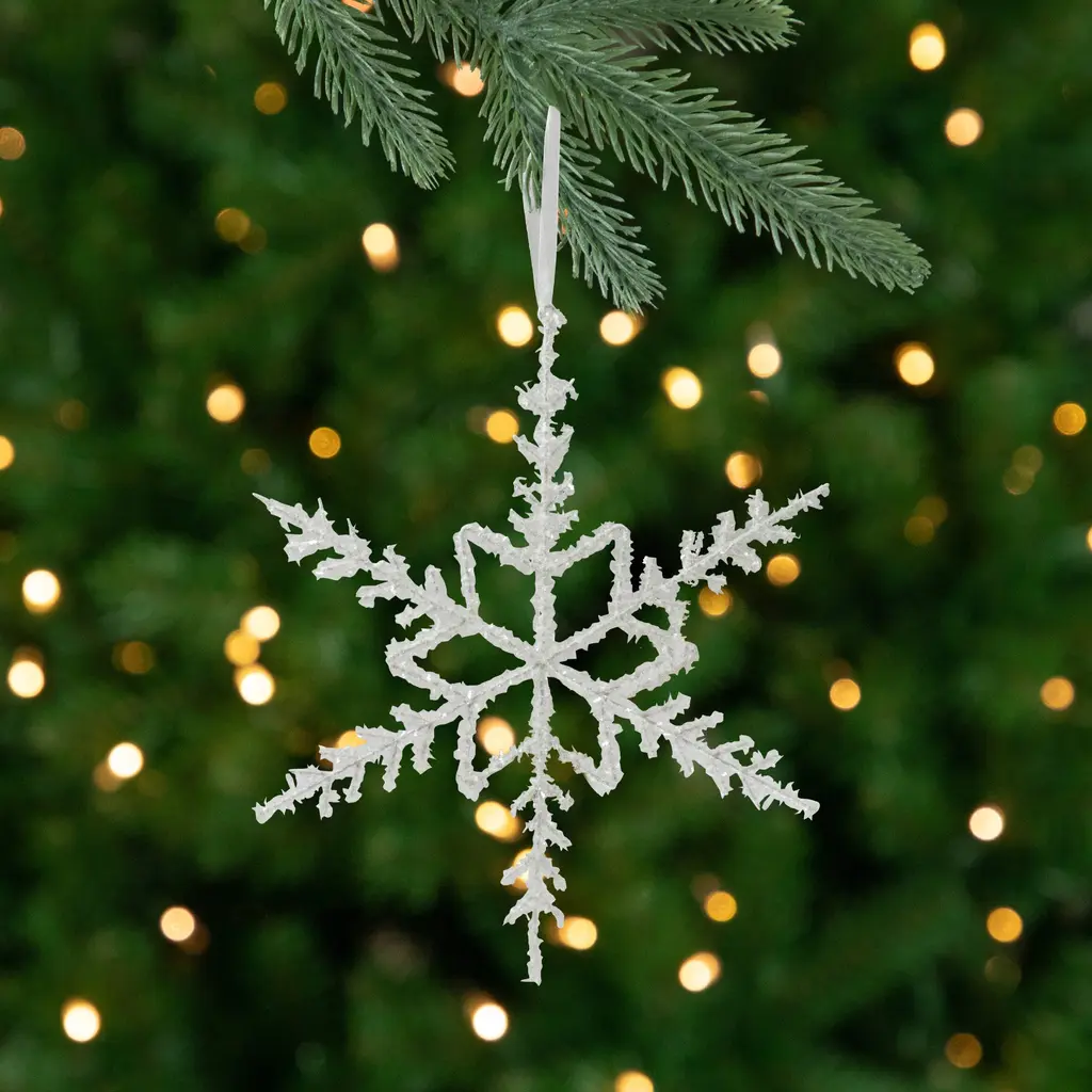 From the Cozy Farmhouse collection this snowflake ornament is the perfect finishing touch for the holiday season. Simply place on your tree with the attached cord. Product Features: Glittered snowflake ornament. Fully dimensional ornament. 6 snowflake arms. Features clear reflective glitter. Comes ready-to-hang on a white cord. Dimensions: 10" diameter. Material(s): metal