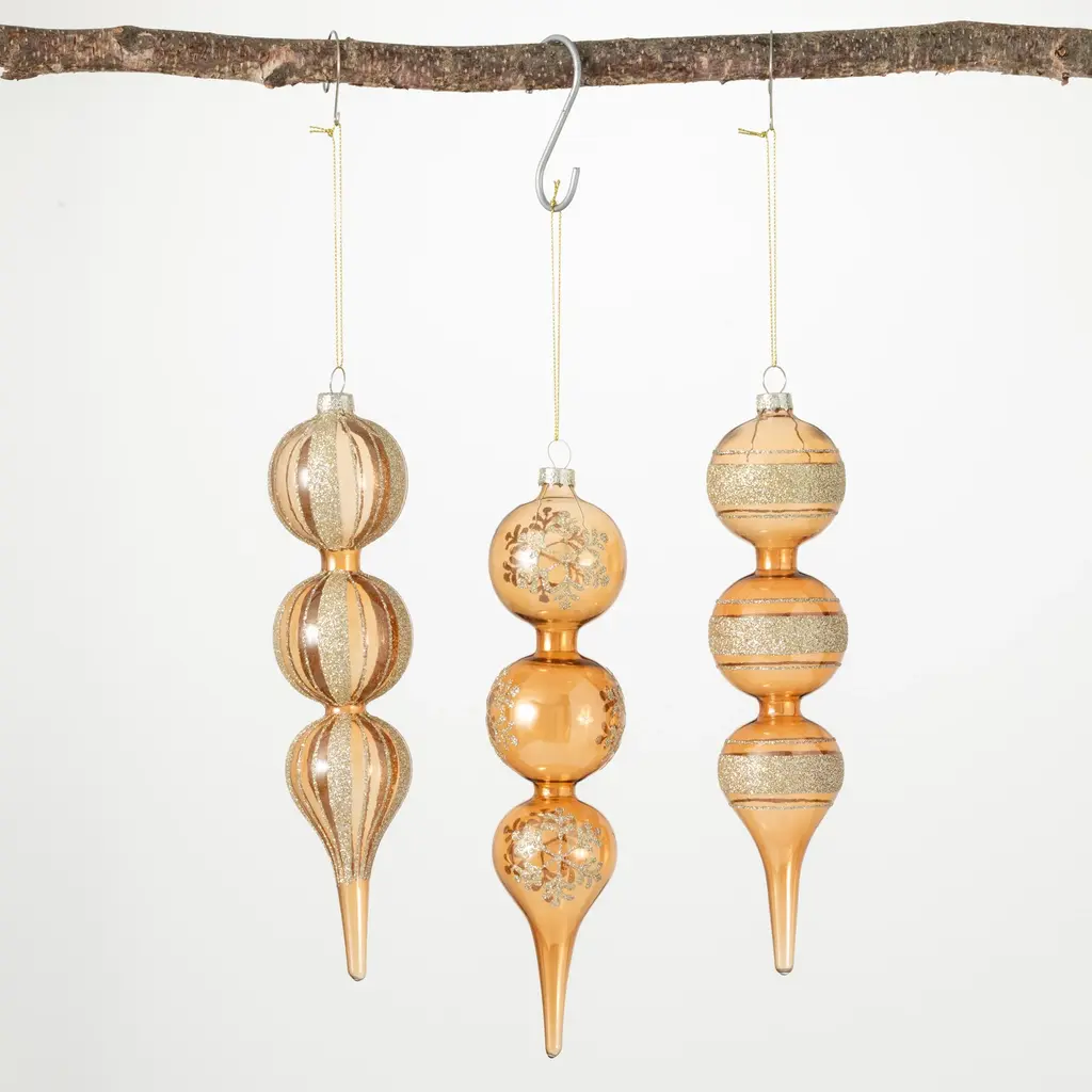 Add a touch of elegance to your evergreen with this exclusive trio of warm gold finials embellished with shimmering glitter creating horizontal or vertical lines and delicate snowflakes. Over the last 55 years, Sullivans has become an industry leader in home decorations. Our brand is rooted in tradition while incorporating modernized trends to keep your home looking up to date with timeless style. Here at Sullivans, we pride ourselves on creating product designs focused on quality and value, ensuring that our customers have access to beautiful products at reasonable price points. • This set of 3 glass finial ornaments is a perfect addition to your holiday decor, adding a touch of sophistication and elegance to your Christmas tree. • Made from high-quality glass with a shiny gold finish, these ornaments exude a luxurious and glamorous vibe, reflecting the warm glow of your Christmas lights. • The dramatic drop shape of these ornaments creates a stunning visual impact, instantly capturing attention and becoming the focal point of your tree decorations. • These Christmas ornaments are not limited to just your tree—they can be used to adorn wreaths, garlands, or even as decorative accents for your holiday table setting, adding a festive touch to any space. • Crafted with care, these glass finial drop ornaments are not only visually appealing but also designed to withstand the test of time. Invest in this set to create a timeless Christmas tradition for years to come. • This item is made of glass • Ornaments measure 2.25"L x 2.25"W x 10"H