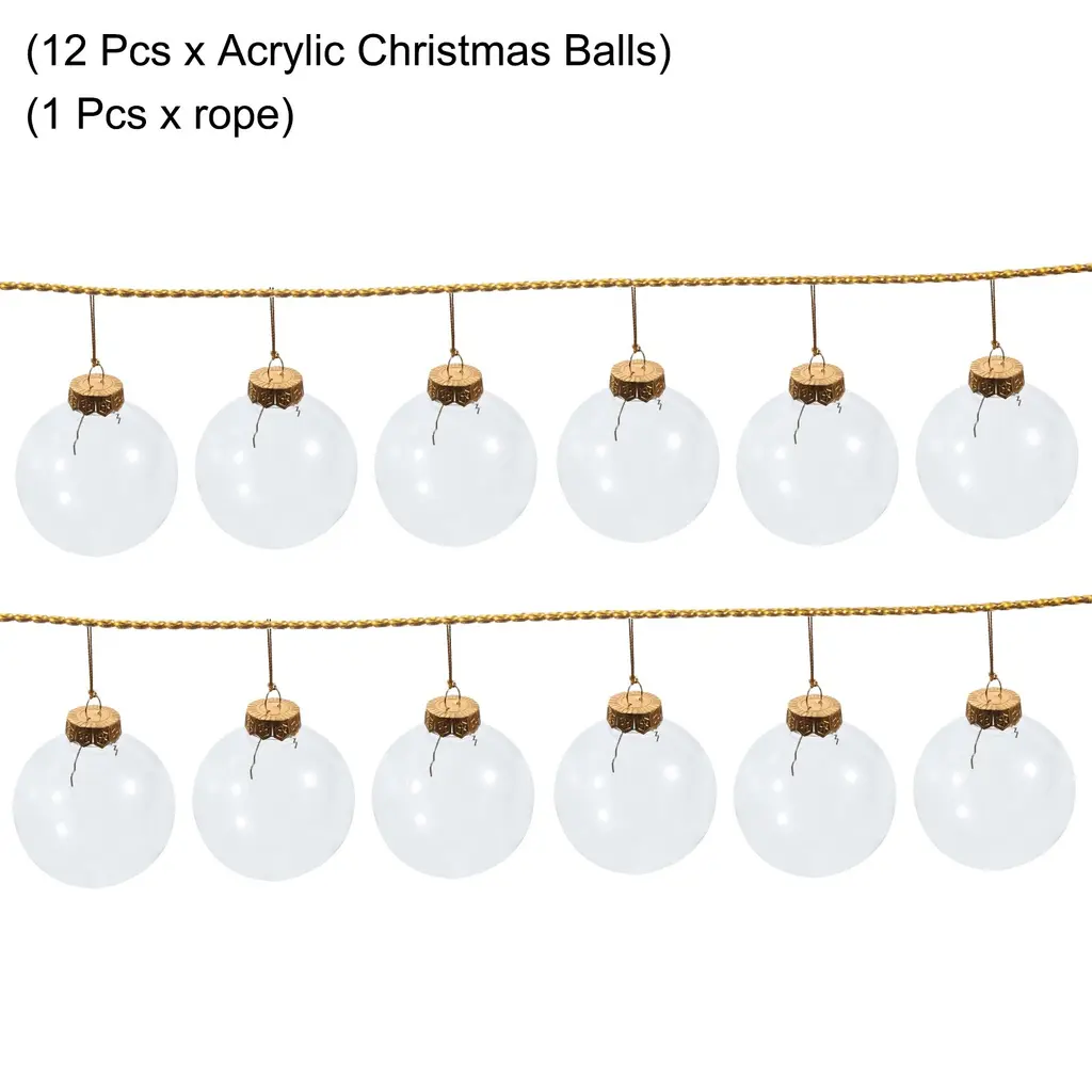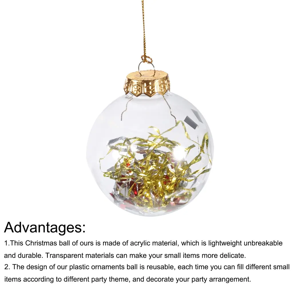 What is this?Plastic ornaments balls suit for DIY craft projects to fill any small items with. Such as candy, cards, gift cards, trinkets. Mainly used to decorate the Christmas tree, very suitable for Christmas, Halloween, wedding, birthday party decoration.What will I get?The Clear Ornaments Balls provides here:Color: Clear, GoldRope Length: 30cm /11.81 inchBall Diameter: 6cm /2.36 inch;8cm /3.15 inchIn the package of: 12Pcs x Acrylic Christmas BallsIs there any advantages of the product?1. This Christmas ball of ours is made of acrylic material, which is lightweight, unbreakable, and durable. Transparent materials can make your small items more delicate.2. The design of our plastic ornaments ball is reusable, each time you can fill different small items according to different party theme, and decorate your party arrangement.3. This craft ball is easy to use, you can hang it anywhere you want to decorate with a rope after filling it with the items you want. For example: doorway, living room, stairs, corridor. Very suitable for different festivals, birthday or wedding parties.How to use it?Open the acrylic ball, then fill it with the small items you want, then tighten it, and hang the rope where you want to decorateWhat should I notice?Please confirm the size you want before purchasing. Please make sure the acrylic ball has been tightened before hanging