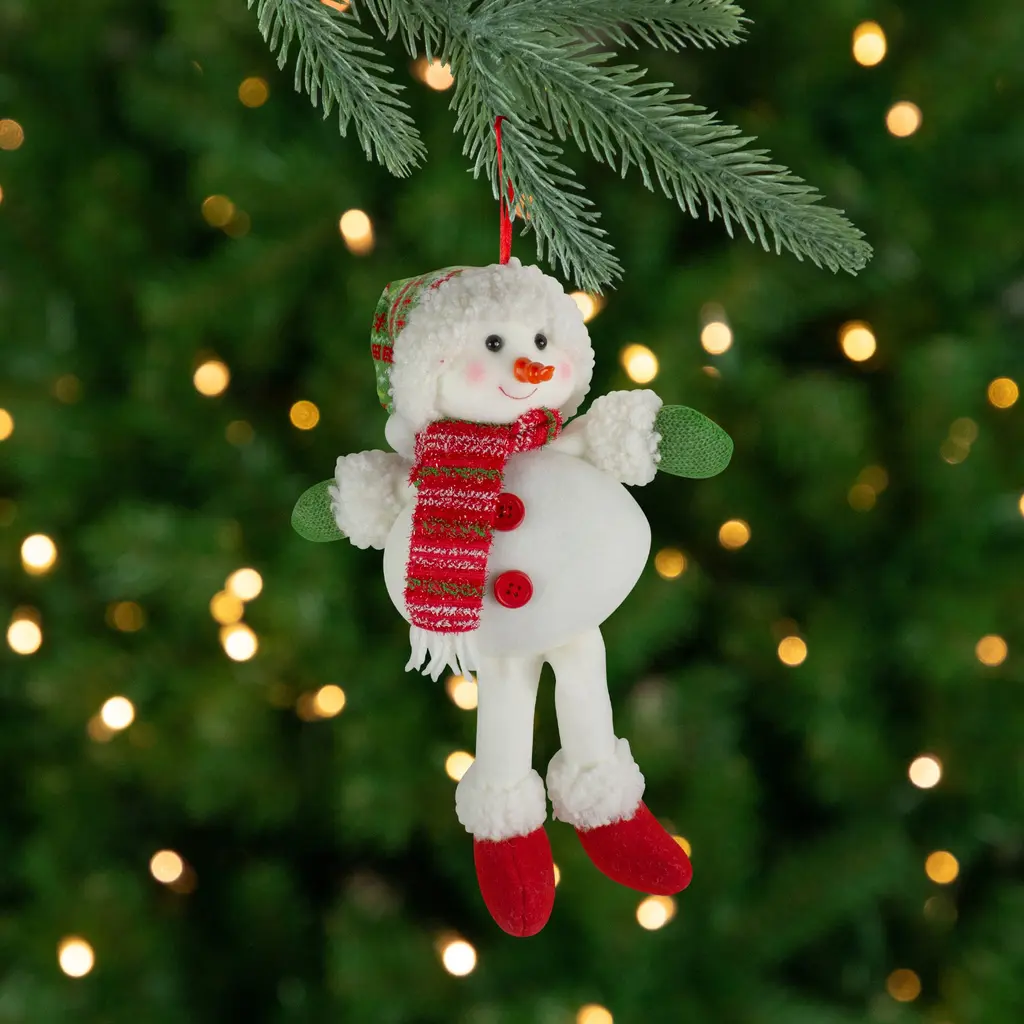 Plush snowman ornament is wearing a festive red and green knit Santa hat with a red and green knit tinsel scarf. This will put the finishing touches on your tree making sure it stands out. He comes ready to hang on a red ribbon cord. Product Features: Smiling jolly snowman Christmas ornament. Snowman wearing a red and green striped hat with matching scarf. Green gloves and red boots complete outfit. Long orange carrot nose and pink rosy cheeks. Comes ready to hang from a red ribbon. Recommended for indoor decorative use only. Dimensions: 13"H x 8"W x 4.5"D. Material(s): polyester/plastic