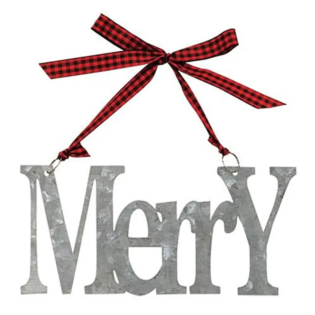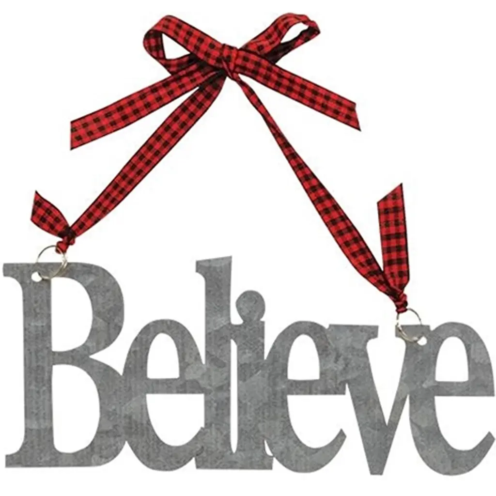 Specification:Description:This galvanized metal ornament features cut-out lettering that reads "Believe" or "Merry," making it a charming addition to your holiday décor. With a stylish red and black gingham hanger tied into a bow, it’s perfect for hanging on your Christmas tree or adding a festive touch to any wall. Measuring 6.5" wide by 2.75" high (7" high with the hanger), this ornament effortlessly enhances the holiday atmosphere in any home. Perfect for spreading seasonal cheer and festive spirit, it’s an ideal choice for gifting or personalizing your holiday setup.