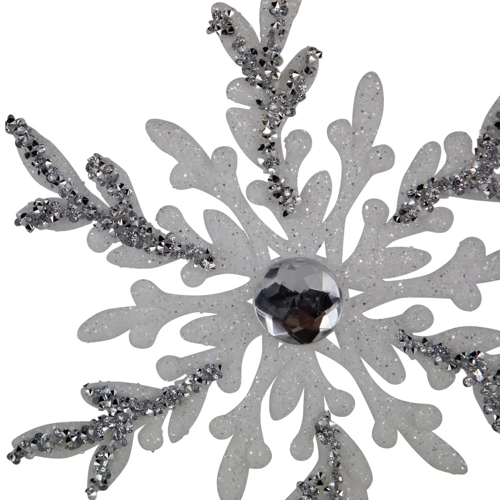 Add a touch of winter wonderland charm to your holiday decor with this set of 2 glittered snowflake Christmas ornaments. These ornaments feature intricately designed snowflakes adorned with shimmering silver glitter. The elegant matte white finish complements any Christmas tree or festive decor theme. Hang them on your tree, wreath, garland, or use them as part of your table centerpiece for a touch of seasonal sophistication. These beautiful ornaments are sure to bring a touch of magic to your holiday season. Features: Set of 2 snowflake Christmas ornaments Matte white finish Each ornament features silver glitter snowflakes with a clear gem at the center Embelished with silver glitter, beads and sequins stripes to add an elegant touch to any holiday decor Equipped with silver ornament caps Each ornament comes ready to hang on a silver cord Recommended for indoor use only Dimensions: 4" diameter Materials: glass