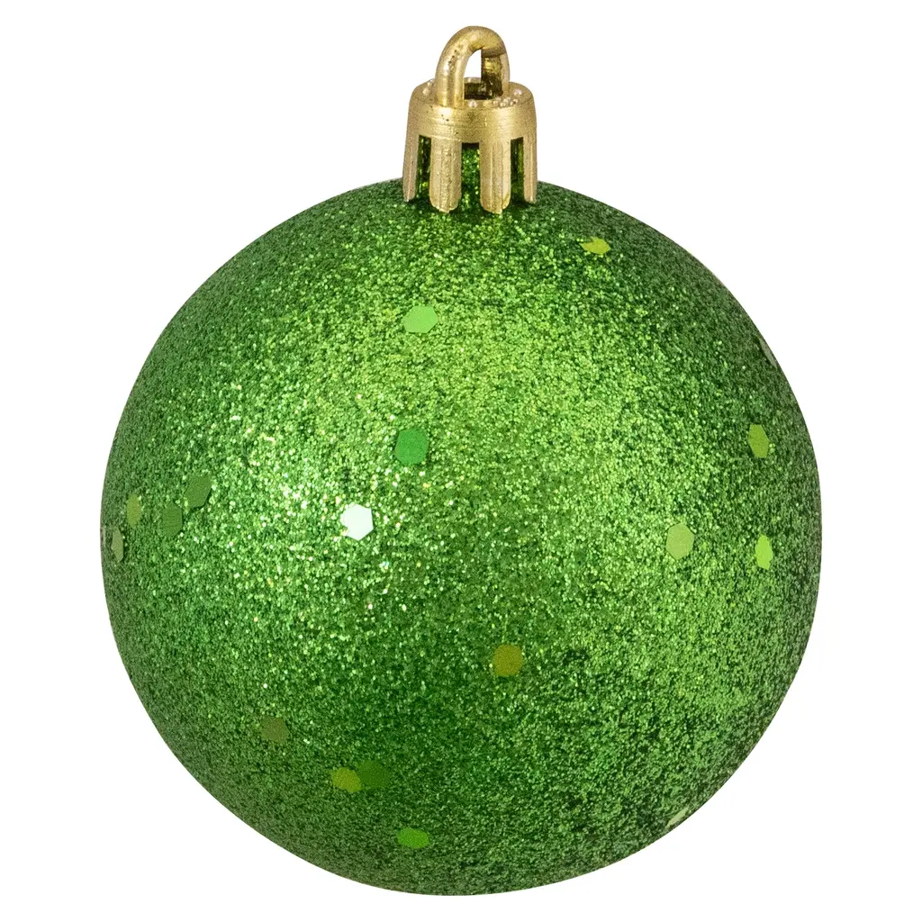Add a shimmering effect to your party hall with these shatterproof ball ornaments. Suitable to hang or hook up to the favorite tree corners or walls they retain a rich luster. They make a fantastic addition to your festive decor. Product Features: 24-piece set. Color: Christmas green. Finish: shiny matte glitter drenched and holographic glitter. Balls are equipped with gold ornament caps. Includes pack of matching gold string hangers. Recommended for indoor decorative use only. Dimensions: 2.5" (60mm) diameter. Material(s): plastic/glitter