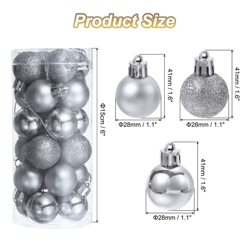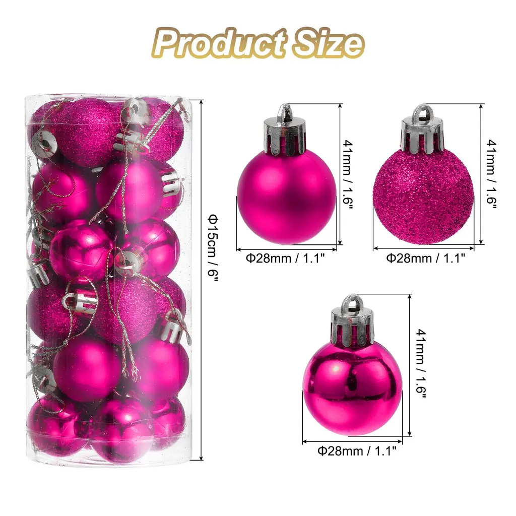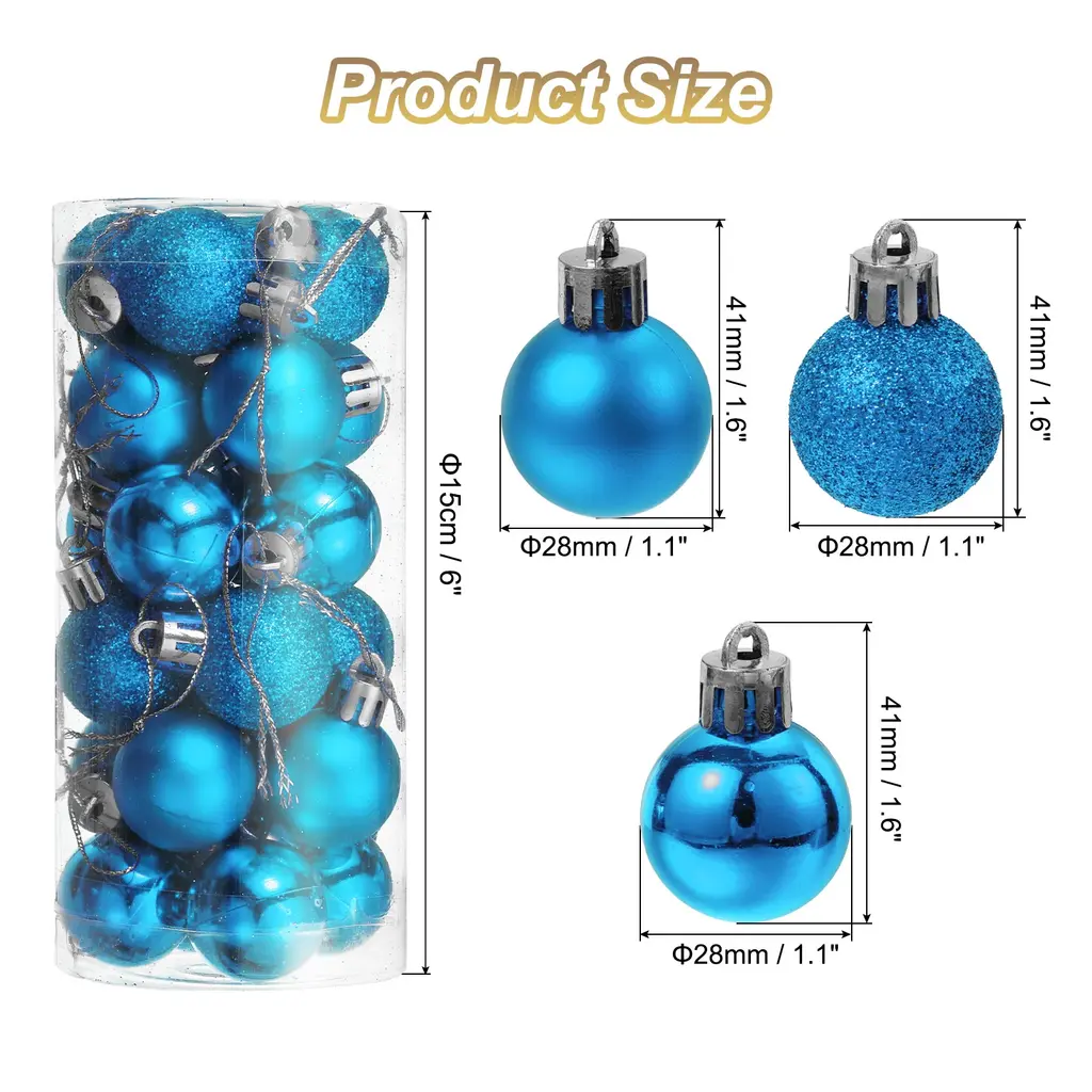 Description:The Christmas decorations balls are made of durable plastic with an electroplating finish, not easy to break or deform, providing a long-term use and bright color, not easy to fade.Composed of 3 different surface style designs: matte, shiny, and glittery, with reflective and shiny lighting effects that can make your Christmas tree look more beautiful and attractive, attaching with other holiday ornaments, adding to the festive atmosphere.Lightweight and comes with a detachable hanging cord that attaches easily to your Christmas tree without weighing down branches, making it perfect for indoor and outdoor DIY Christmas tree projects.The decorative hanging balls are good choices for Christmas tree decorations, wedding, birthday party and other party decorations, holiday decorations, DIY craft projects. Good for homes, shops, office, markets, hotels, and more.Specification:Material: PlasticTotal Size: 28mmx41mm/1.1"x1.6"(Dia.*L)Package Content:1Set - 24Pcs x Christmas Balls Ornaments(8Pcs x Each Style)