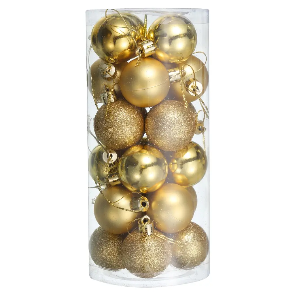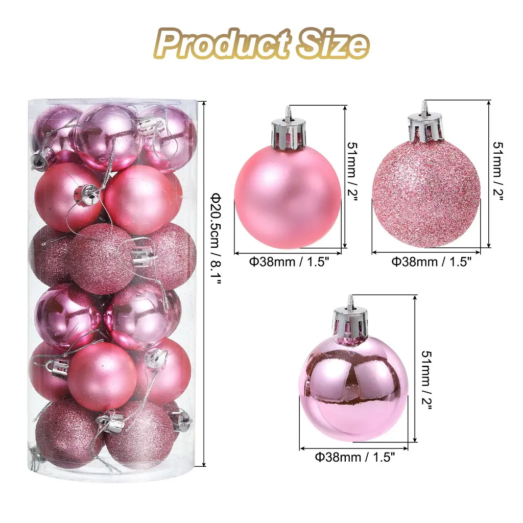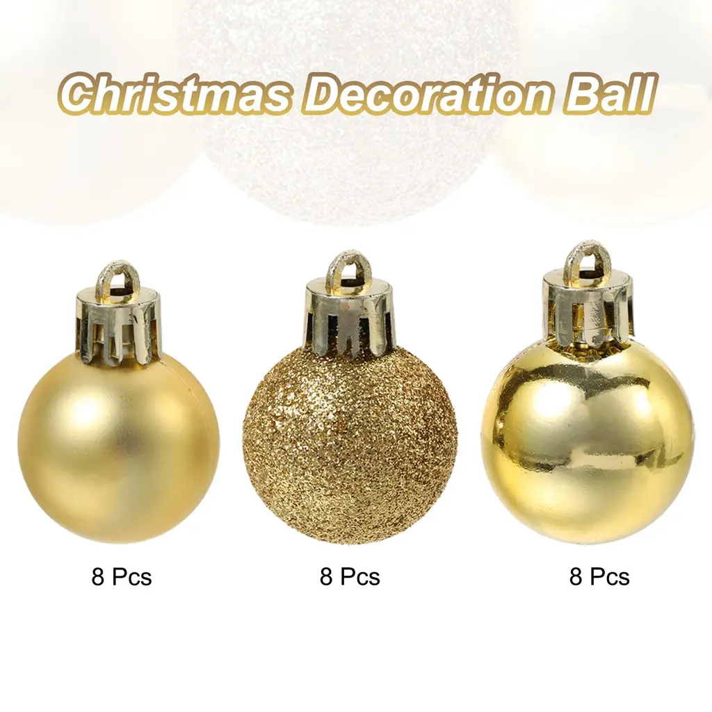 Description:The Christmas decorations balls are made of durable plastic with an electroplating finish, not easy to break or deform, providing a long-term use and bright color, not easy to fade.Composed of 3 different surface style designs: matte, shiny, and glittery, with reflective and shiny lighting effects that can make your Christmas tree look more beautiful and attractive, attaching with other holiday ornaments, adding to the festive atmosphere.Lightweight and comes with a detachable hanging cord that attaches easily to your Christmas tree without weighing down branches, making it perfect for indoor and outdoor DIY Christmas tree projects.The decorative hanging balls are good choices for Christmas tree decorations, wedding, birthday party and other party decorations, holiday decorations, DIY craft projects. Good for homes, shops, office, markets, hotels, and more.Specification:Material: PlasticTotal Size: 38mmx51mm/1.5"x2"(Dia.*L)Package Content:1Set - 24Pcs x Christmas Balls Ornaments(8Pcs x Each Style)