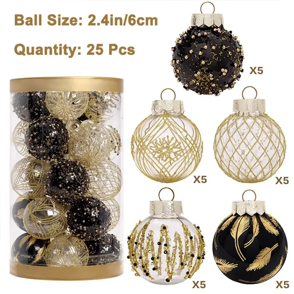 Christmas Tree Ornaments 25 Pcs, 2.4 Inch Shatterproof Plastic Christmas Balls, Clear PET Painted Holiday Decorations for Xmas Tree, Party, WeddingProduct DescriptionElevate your holiday d¨¦cor with this exquisite set of 25 Christmas Tree Ornament Balls, designed to bring brilliance and durability to your festive celebrations. Each 2.4-inch ornament is crafted from high-quality, clear PET plastic and features vibrant painted designs inspired by classic Christmas elements. Shatterproof and fade-resistant, these ornaments withstand accidental drops while maintaining their vibrant colors season after season. Perfect for Christmas trees, weddings, parties, and beyond, this versatile set offers a blend of elegance, functionality, and creativity to transform any space into a festive wonderland.Key Features Diverse Christmas Designs Includes 25 ornaments with 5 distinct Christmas-themed patterns (5 pieces per design). Features classic holiday motifs like snowflakes, reindeer, stars, trees, and holly for a cohesive yet varied decorative appeal. Shatterproof & Durable Made from high-quality PET plastic, these ornaments are lightweight, non-breakable, and resistant to fading. Tested to withstand drops from up to 2 meters on hard surfaces without damage. Vibrant Colors & Patterns Each ornament is meticulously painted with rich, festive colors and intricate designs that catch the light beautifully, adding a playful yet elegant touch to your d¨¦cor. Easy to Hang & Display Pre-attached hanging rings simplify installation on Christmas trees, wreaths, windows, mantels, or railings. The 2.4-inch diameter is ideal for both large and small spaces. Multi-Occasion Use Versatile for Christmas, weddings, engagements, anniversaries, office parties, and commercial displays. Complements indoor and outdoor d¨¦cor themes. Specifications Material: Clear PET Plastic (Shatterproof) Finish: Painted with Festive Patterns Diameter per Ornament: 2.4 Inches (6 cm) Quantity: 25 Pieces (5 Designs ¡Á 5 Each) Features: Shatterproof, Fade-Resistant, Lightweight Included Accessories: Pre-Attached Hanging Rings Recommended Uses: Christmas Trees, Wreaths, Windows, Parties, Weddings Occasion: Christmas, Holidays, Celebrations Design VarietiesThe set includes 5 unique designs: Snowflake Pattern: Icy blue and silver accents. Reindeer Silhouette: Brown and gold festive motifs. Star Pattern: Gold and yellow sparkling designs. Christmas Tree Outline: Green and red holiday colors. Holly & Berries: Traditional red and green botanical patterns.