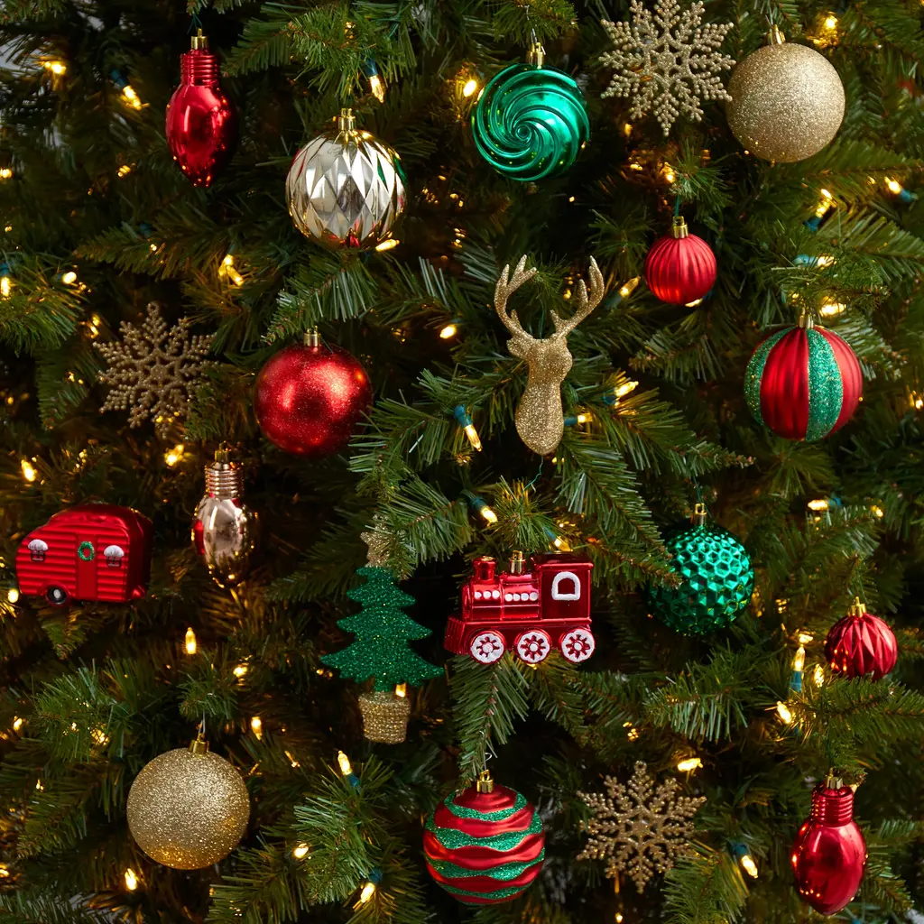 Description Relive the nostalgia of holidays past with our charming set of 25 shatterproof Christmas tree ornaments. Featuring classic Christmas symbols such as a Christmas tree, train, reindeer, and decorations, all in a palette of festive colors, this coordinated set completes any holiday decor scheme with timeless appeal. Crafted to be shatterproof, these seasonal ornaments ensure worry-free enjoyment for years to come. Arriving in a reusable tray for convenient storage and continued seasonal use, they're perfect for mixing and matching to create a personalized display. Plus, for an extra touch of sparkle, some of the ornaments come adorned with glitter.Specifications:
