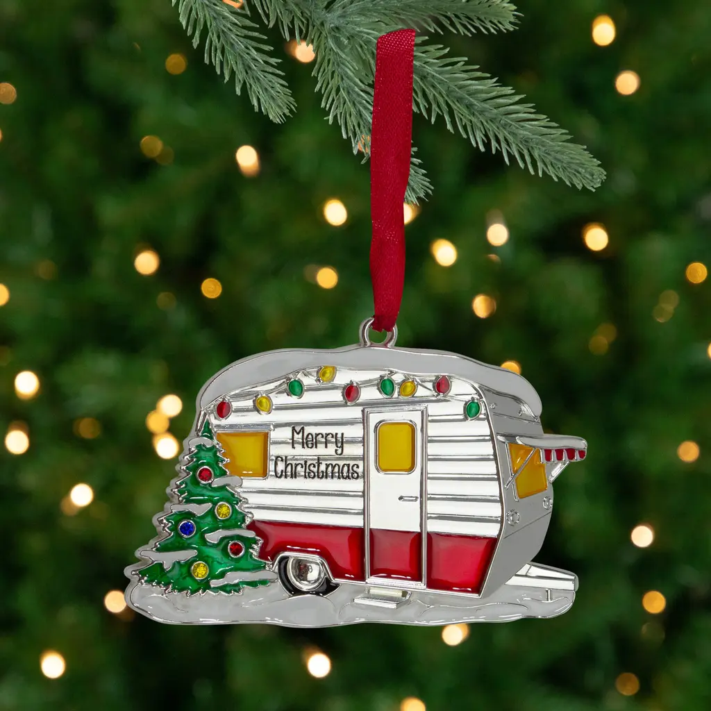 Camping is the perfect way to relax. This stunning ornament features a caravan camper Christmas tree and the words Merry Christmas. 5 European crystals embellish the piece. Share your love for camping with any and all who look upon this ornament. This unique ornament would be a perfect addition to your Christmas tree or a great gift for the camper in your life! Product Features: Christmas camper ornament. Embellished with 5 European Crystals. One-sided ornament. Comes ready to hang by a red ribbon. Silver plated and enamel coating. Dimensions: 2.25"H x 3.5"W x 0.25"D. Material(s): silver plating/enamel/metal