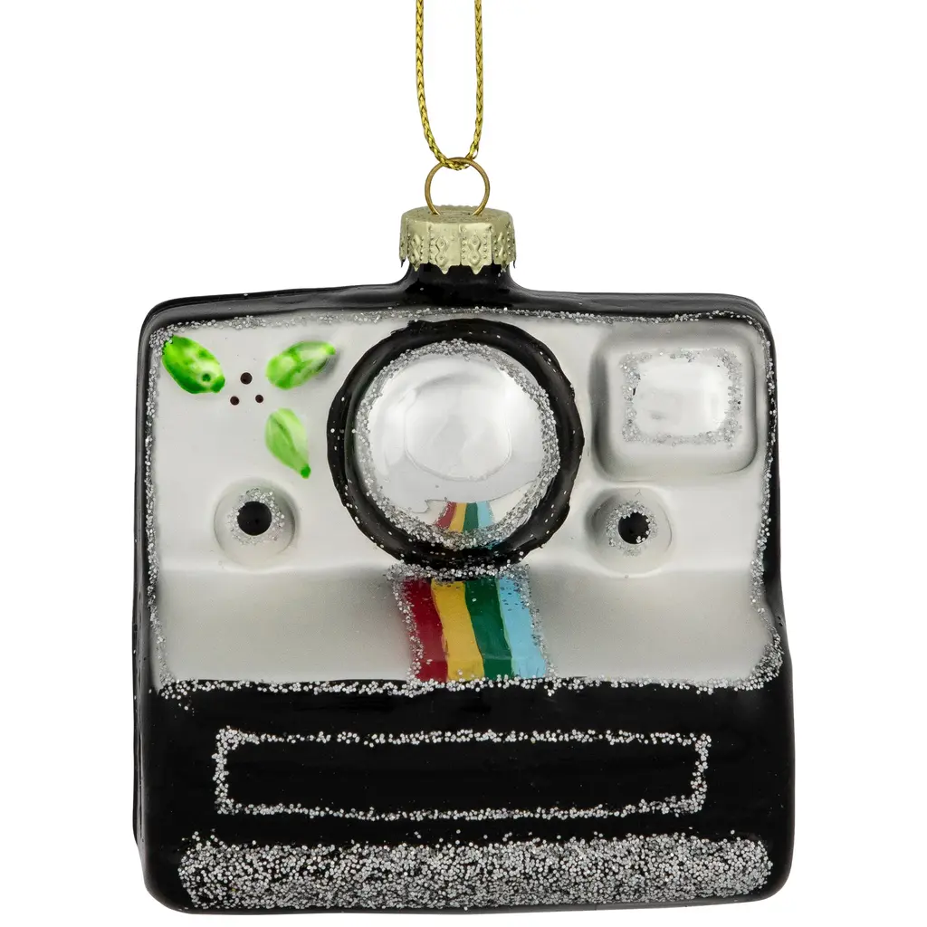 Capture the magic of nostalgia with this instant camera, glass ornament. This ornament is designed as a miniature Polaroid camera with a lens and flash buttons, reminiscent of vintage instant cameras. A charming rainbow stripe and holly leaves add a touch of whimsy to any holiday decor. To make it even more special, the ornament is embellished with sparkling glitter, creating a festive and eye-catching centerpiece for your Christmas tree. Relive the joy of capturing memories and add a dash of retro charm to your holiday season with this exquisite ornament. Product Features: Glass retro instant camera Christmas ornament Features lens and flash buttons Holly leaves and a rainbow stripe design Embellished with iridescent glitter Fully dimensional ornament Comes with an ornament cap and gold cord For indoor use only Dimensions: 2.75"H x 3"W x 3"D Material(s): glass