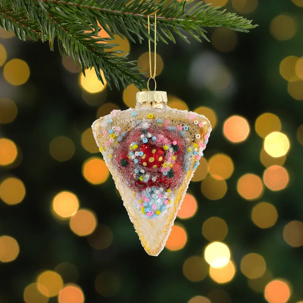 Add a touch of sweetness to your Christmas tree with our slice of cake glass ornament. This yummy ornament features a frosted finish, beautifully accented with blue, pink, yellow, and white sprinkles, reminiscent of a festive cake. The top layer is adorned with a luscious strawberry flower and a blue gumdrop. With delectable, golden layers, this ornament will bring a shimmering and scrumptious vibe to your holiday decorations. Product Features: Slice of cake Christmas ornament Two gold layers with frosting On top is a strawberry and gumdrop Accented with blue, yellow, pink, and white beads Fully dimensional ornament Comes with a silver ornament cap and gold cord For indoor use only Dimensions: 2"H x 2.5"W x 3.25"D Material(s): glass