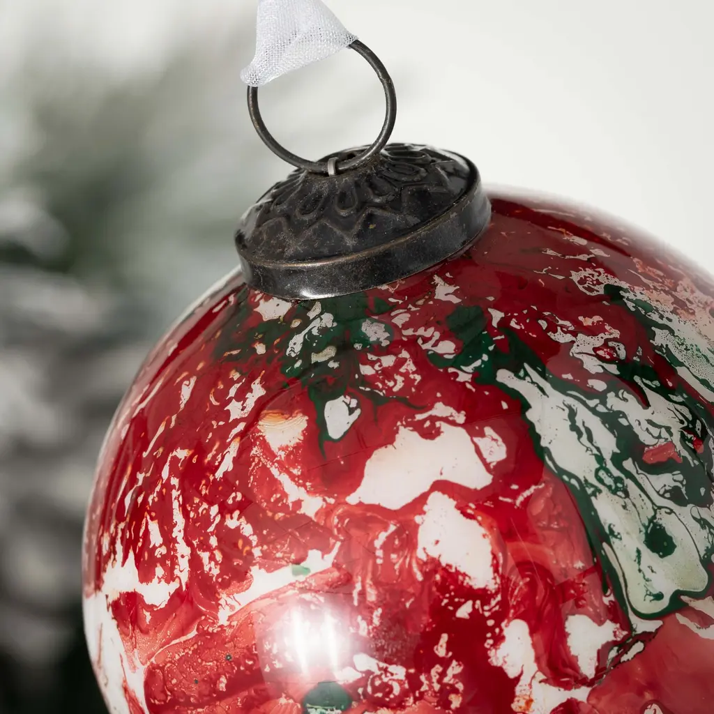 This exclusive Kugel ornament from Sullivans Home Decor brings classic holiday cheer. With a traditional ball shape and a timeless red, green and white color scheme, this ornament will fit right in with any traditional decor while adding a touch of modern flare with its interesting swirl pattern. Simple yet impactful, this ornament will become a treasured addition to your collection for years to come. • Vibrant Festive Colors: Adorn your Christmas tree with our Red Green Swirl Kugel Ornament, showcasing striking red and green swirls that evoke the spirit of the holiday season. • Handcrafted Elegance: Crafted from high-quality glass, this ornament exudes elegance and durability, promising to be a cherished part of your holiday decor for years to come. • Versatile Decor: Not limited to just Christmas trees, this ornament can also be used to enhance wreaths, garlands, mantels, and other indoor holiday displays, adding a pop of color and charm. • Traditional Charm: With its classic kugel design, this ornament blends traditional craftsmanship with modern holiday aesthetics, perfect for both rustic and contemporary Christmas themes. • Easy Integration: Measuring 4.5 inches tall by 4 inches wide, this ornament is compact yet impactful, seamlessly integrating into your existing Christmas ornament collection and decor setup. • Experience Timeless Elegance with Sullivan's Home Decor - Celebrating Over 55 Years of Excellence! Explore our extensive collection of quality products, meticulously curated to suit every style, season, and occasion. From classic designs to on-trend accents, Sullivan's Home Decor seamlessly blends tradition with modernity, ensuring there's something special for everyone. Transform your living spaces with our enduring commitment to style and sophistication. • Ornament measures 4"L x 4"W x 4.5"H
