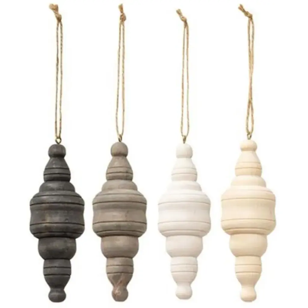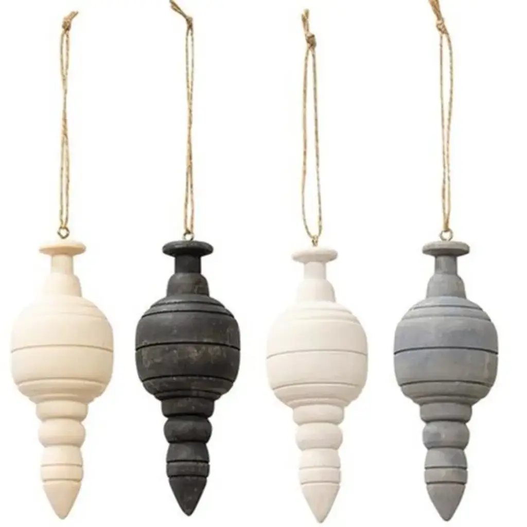 Specification: Description:This Wooden Spindle Ornament set includes four distinct designs, each with a distressed finish in black, grey, tan, or white, perfect for complementing farmhouse-style decor. The ornaments are designed to resemble spindles and come with a pre-attached string hanger for easy display. Ideal for hanging on a hook, nail, or holiday tree, these charming ornaments add a rustic touch to any setting. Each piece measures 4 inches in height, making them versatile and attractive accents for your home or seasonal decorations.