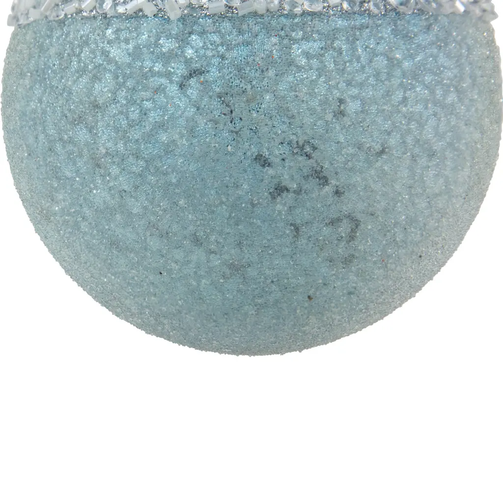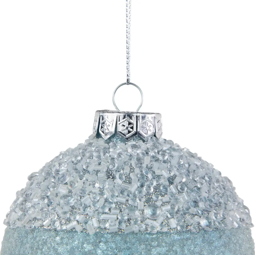 Add a touch of elegance and sophistication to your Christmas tree with this stunning silver and icy blue beaded glass Christmas ornament. The delicate glass surface is adorned with shimmering beads creating a dazzling display of winter wonderland-inspired beauty. Whether you're looking to complement modern or traditional holiday decor this ornament is sure to make a statement and become a cherished addition to your holiday collection. Product Features: Frozen ice glass ball ornament Glittered crackle glass design Embellished with clear and white beads Comes with a silver ornament cap and cord Recommended for indoor use only Dimensions: 4" diameter Material(s): glass