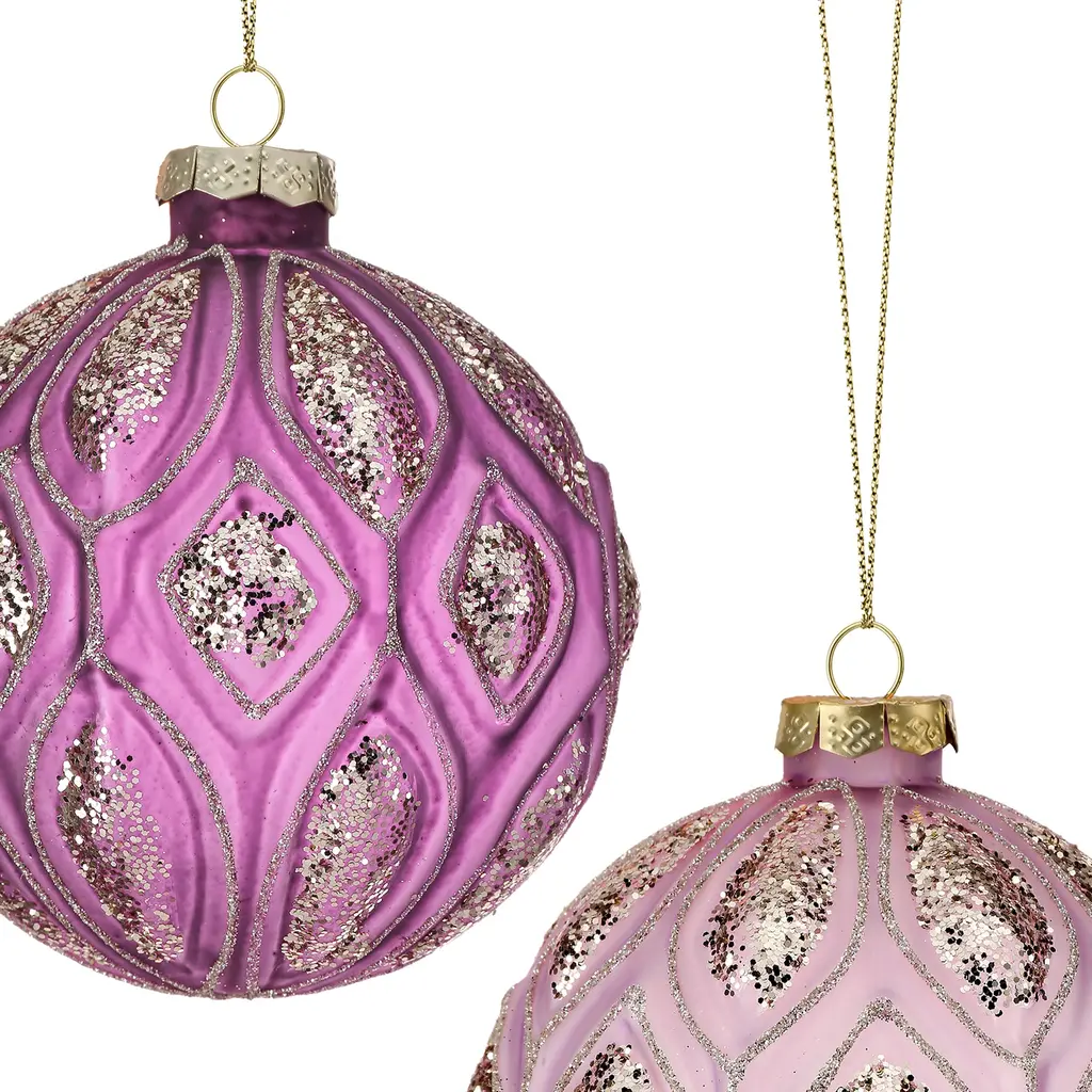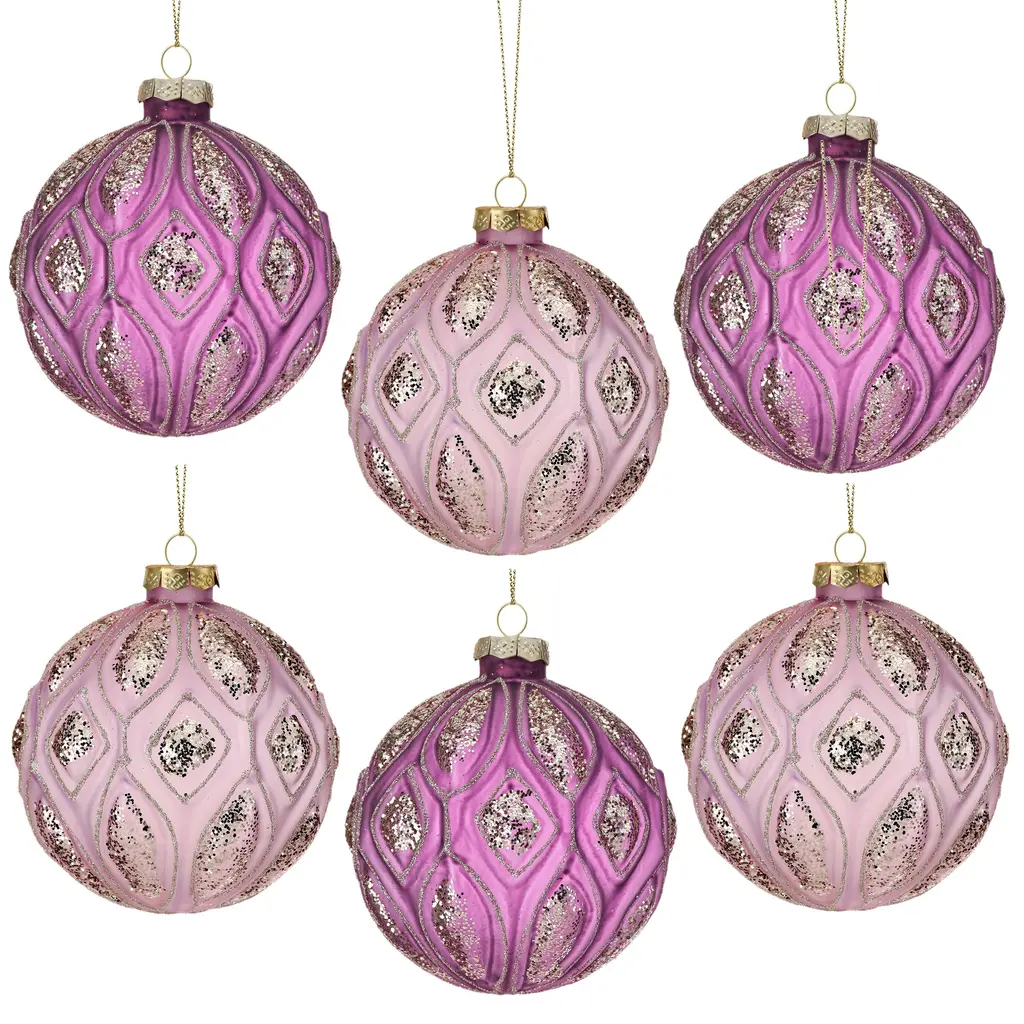 4" Frost Glass With Glitter Ball Ornament Set Of 6 - Purple