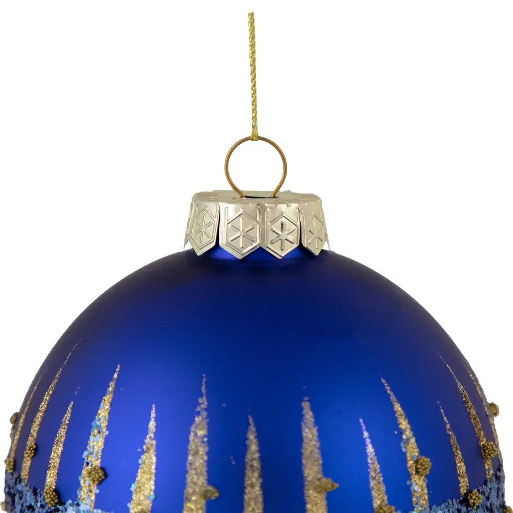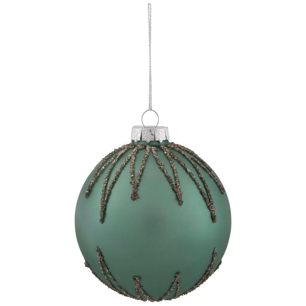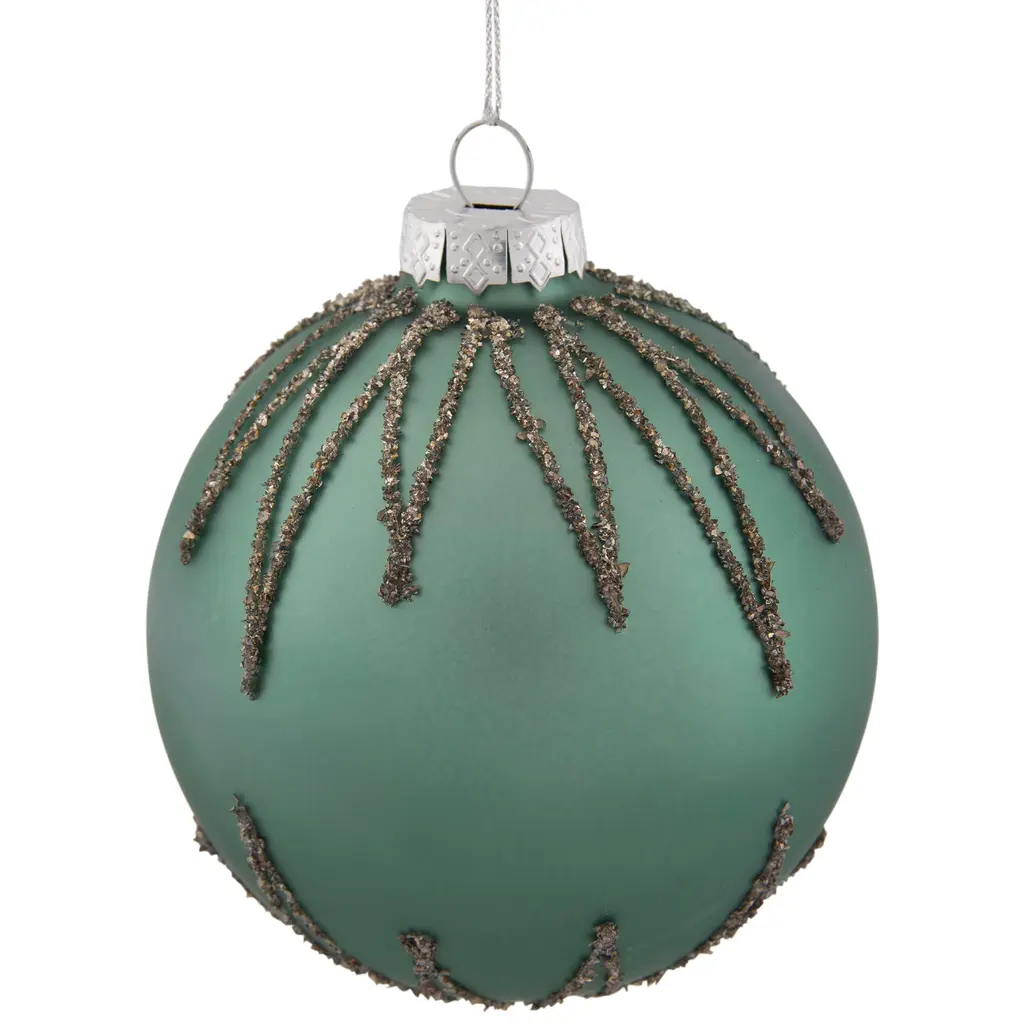 Glass ball ornaments are one of a kind! A classic shape with fresh designer colors this ball ornament will allow you to build your collection quickly and decorate with more possibilities. This matte green ornament with a glittered starburst designs is great for Christmas and all the way through the New Year. Product Features: Color: green. Finish: matte. Glittered starburst designs. Equipped with a gold ornament cap. Comes ready-to-hang on a gold cord. Dimensions: 4" in diameter. Material(s): glass/metal