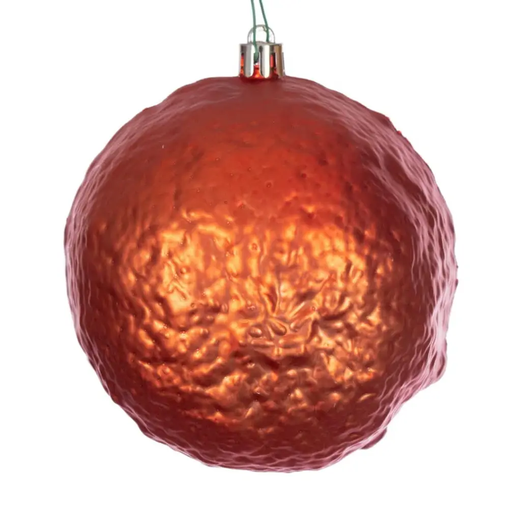 4" Orange Fruit Ornament. Each bag includes six ornaments. Each ornament measures about 4 inches wide, is made of shatterproof plastic, rated for indoor use, and features a matte finish. It features wire that is looped through the neck of the ornament and cap for hanging, ensuring that the cap doesn't fall off. Each bag includes six ornaments.