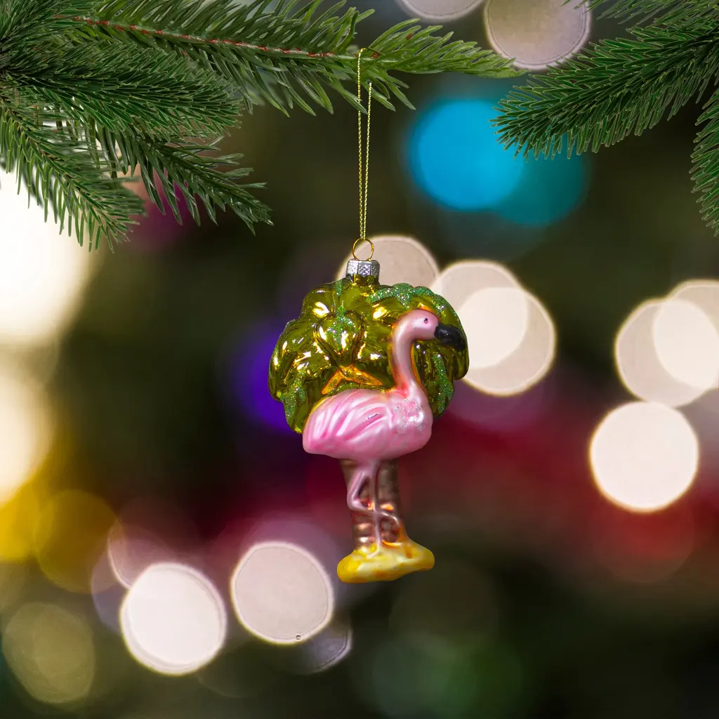 Give your holiday decor a fun look with this exquisitely detailed glass ornament. It features a bright pink flamingo standing with a green palm tree. A great way to make decorating fun and whimsical. Product Features: Flamingo hanging Christmas ornament. Features a green palm tree. Equipped with a silver ornament cap and cord. Fully dimensional ornament. Ornament is embellished with glitter. Recommended for indoor use only. Dimensions: 4"H x 3"W x 1.5"D. Material(s): glass