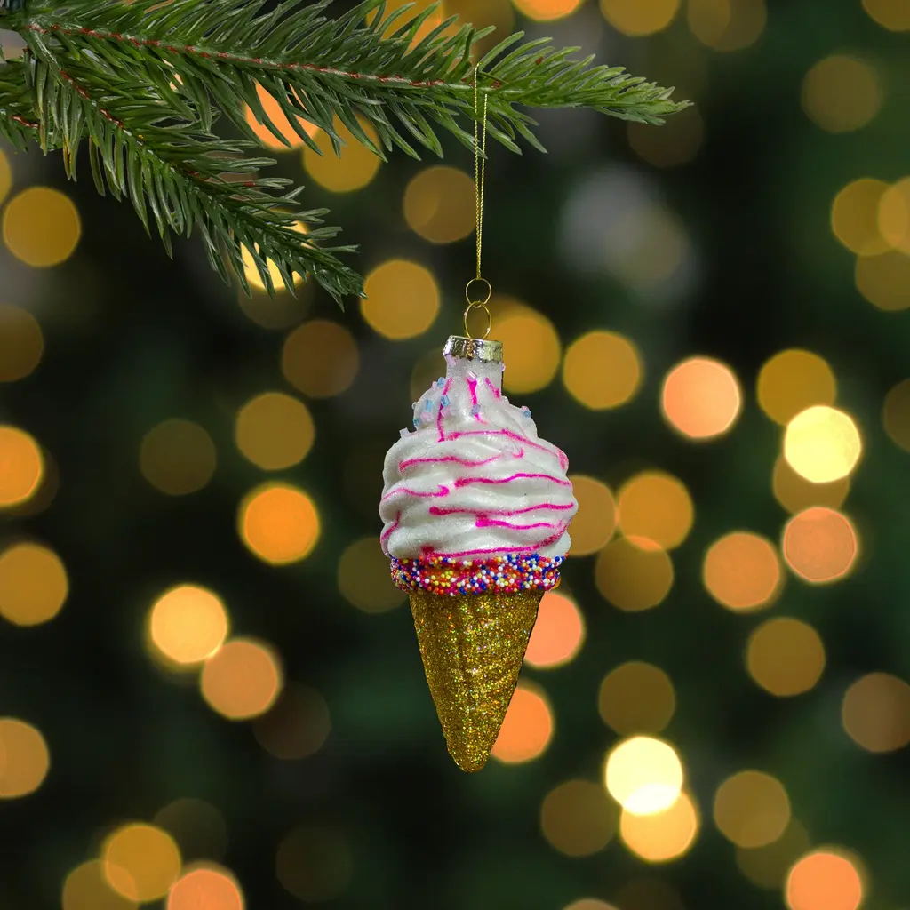 I scream you scream everyone will scream for this fun Christmas ornament! This ornament features a golden waffle cone vanilla ice cream and sprinkles and is accented with gold glitter to add a little extra sparkle to your tree your mantle window or anywhere you wish to add a little bit of holiday flair. Product Features: Glass ice cream cone Christmas ornament. White twist ice cream with pink accents. Blue iridescent sprinkles on top multi-color sprinkles around the rim of the cone. Gold glitter-drenched cone. Fully dimensional ornament. Comes ready to hang on a gold cord. For indoor use only. Dimensions: 4.75"H x 2.25"W x 2"D. Material(s): glass
