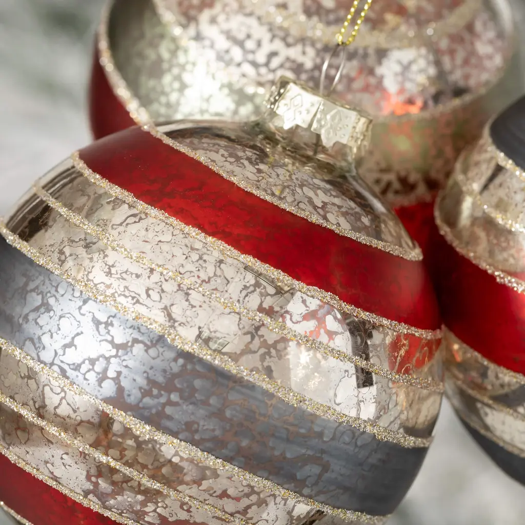 These festive striped ball ornaments will bring a pop of color and whimsy to your Christmas decor. Exclusive to Sullivans Home Decor, each ornament features a unique stripe design in a vibrant blend of blue, green and red hues on a silver base. Simply hang them from the attached loop or place them in a bowl-either way, these striped beauties are sure to become a favorite part of your yearly decorating tradition, delighting young and old with their vivid colors and updated Christmas charm. • Elegant Striped Design: Our Striped Silver Ball Ornaments feature a classic yet stylish design, adding sophistication to your holiday decor. • Generous Size: Each ornament measures 4 inches tall, making them a prominent and eye-catching addition to your Christmas tree or indoor decorations. • Quality Glass Construction: Crafted from high-quality glass, these ornaments boast durability and shine, ensuring they remain a cherished part of your holiday collection for years to come. • Multicolor Elegance: Adorned with multicolored stripes, including silver, gold, red, and green, these ornaments bring a festive and vibrant touch to any Christmas setting. • Complete Set: This set includes a collection of Striped Silver Ball Ornaments, providing you with everything you need to create a cohesive and elegant holiday display. Perfect for enhancing the beauty of your Christmas tree or adding flair to other indoor decor elements. • Experience Timeless Elegance with Sullivan's Home Decor - Celebrating Over 55 Years of Excellence! Explore our extensive collection of quality products, meticulously curated to suit every style, season, and occasion. From classic designs to on-trend accents, Sullivan's Home Decor seamlessly blends tradition with modernity, ensuring there's something special for everyone. Transform your living spaces with our enduring commitment to style and sophistication. • Ornaments measure 4"L x 4"W x 4"H